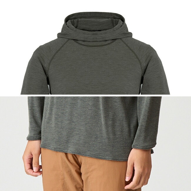 ふんわり優しい肌触りが特長の革新的なウール素材NUYARNを採用したロングスリーブフーディーです。素材の良さを引き出すために敢えてシンプルなデザインを採用し、レイヤードの際の肩まわりのごろつきをなくすためにラグランスリーブで仕上げています。