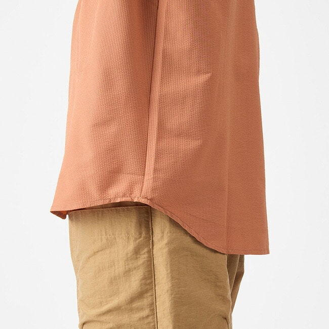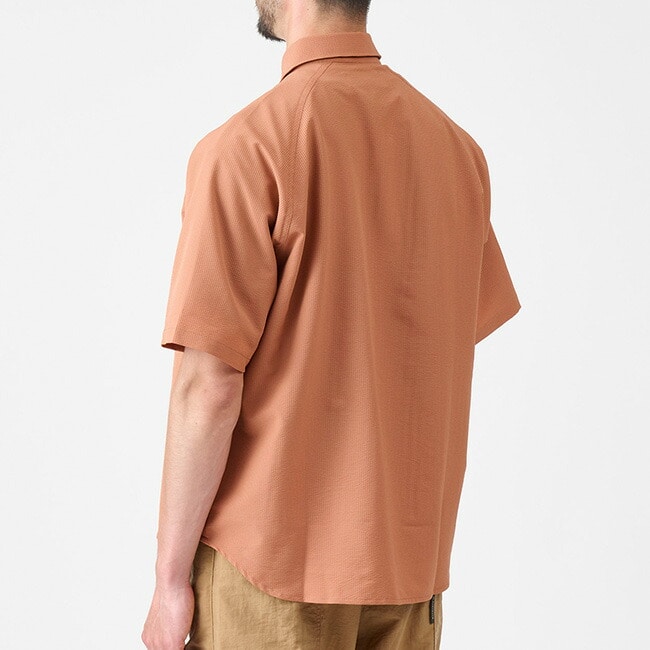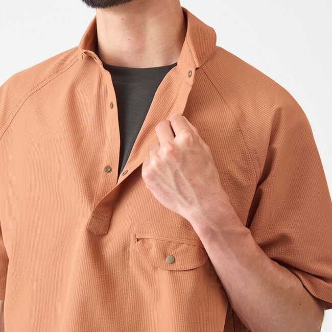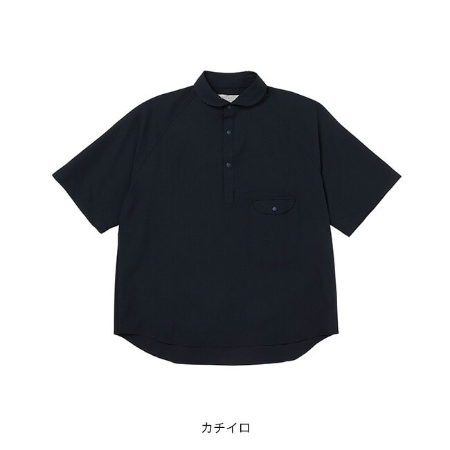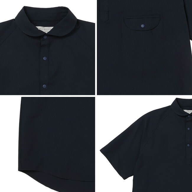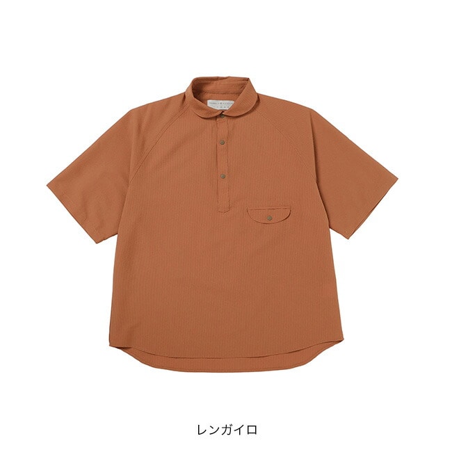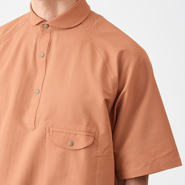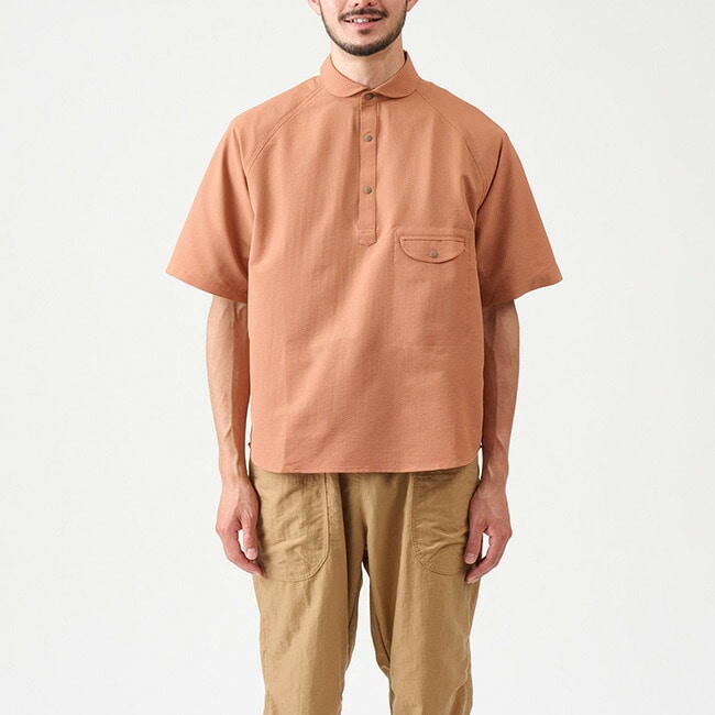 ショートラウンドカラーがアクセントの半袖プルオーバーシャツです。ふんわり優しい肌触りと清涼感のあるサッカー素材の表面には細かな凸凹があるので肌に張り付きにくく、高い通気性も備えているので非常に快適です。