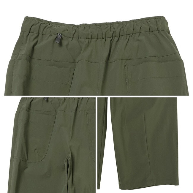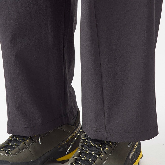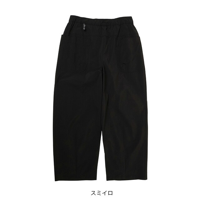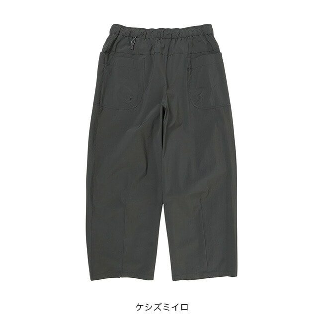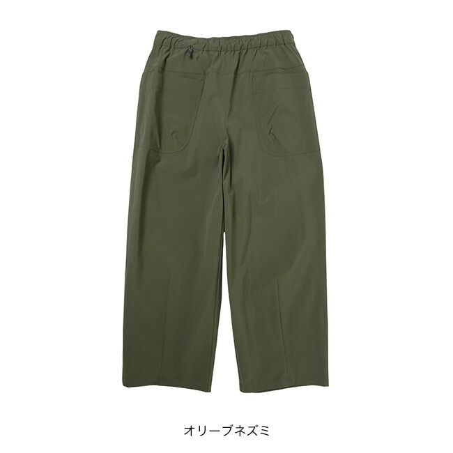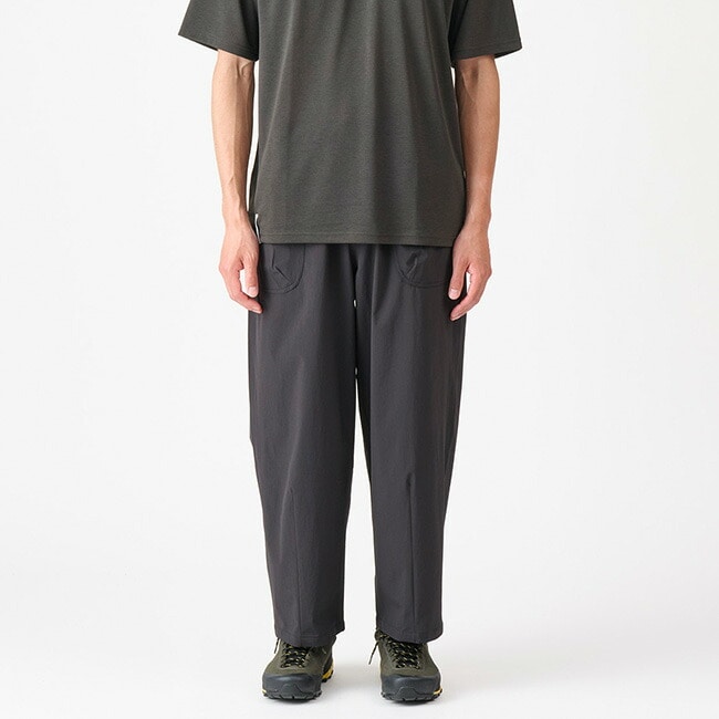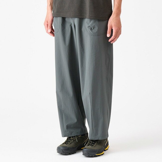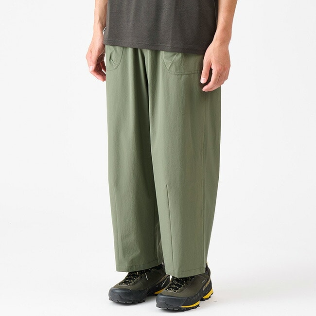 さらりとした風合いがドレッシーな雰囲気を醸し出すカーブパンツです。膝下の前後に設けた長いダーツがワイドパンツのシルエットにメリハリをつけ、素材のストレッチ性とワイドシルエットによって長い石段や段差の多いルートもストレスなく歩くことができます。