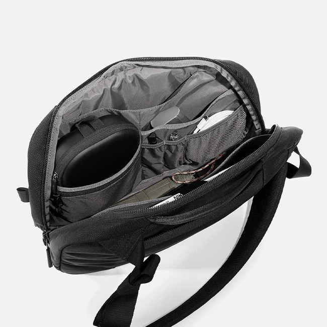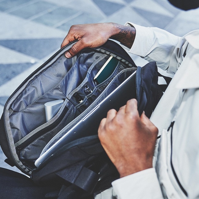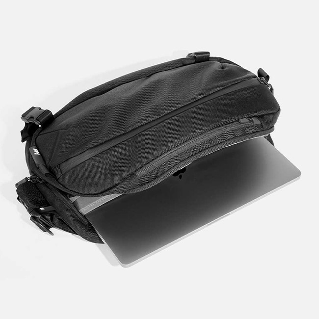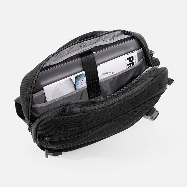 パッド付きのラップトップ用ポケット、日常の必需品を収納できる内部のポケットが備わり、目的に応じて多様な持ち方が可能なスリングストラップがついています。