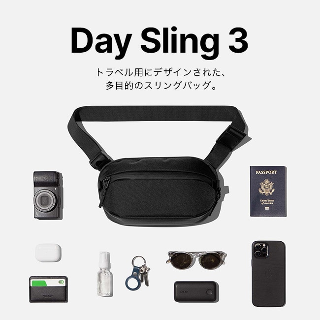 Day Sling 3は、トラベル用にデザインされた多目的のスリングバッグです。モノの出し入れがしやすいメインストレージのほか、デイリーライフにおける必需品を収納できる機能的な複数のポケットを備えています。