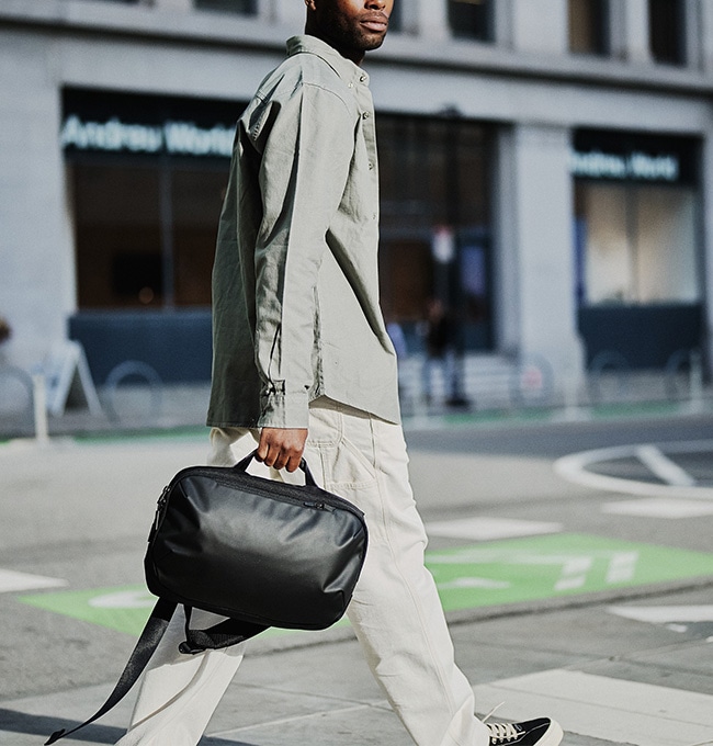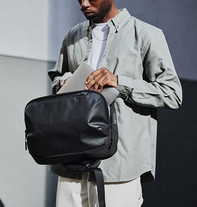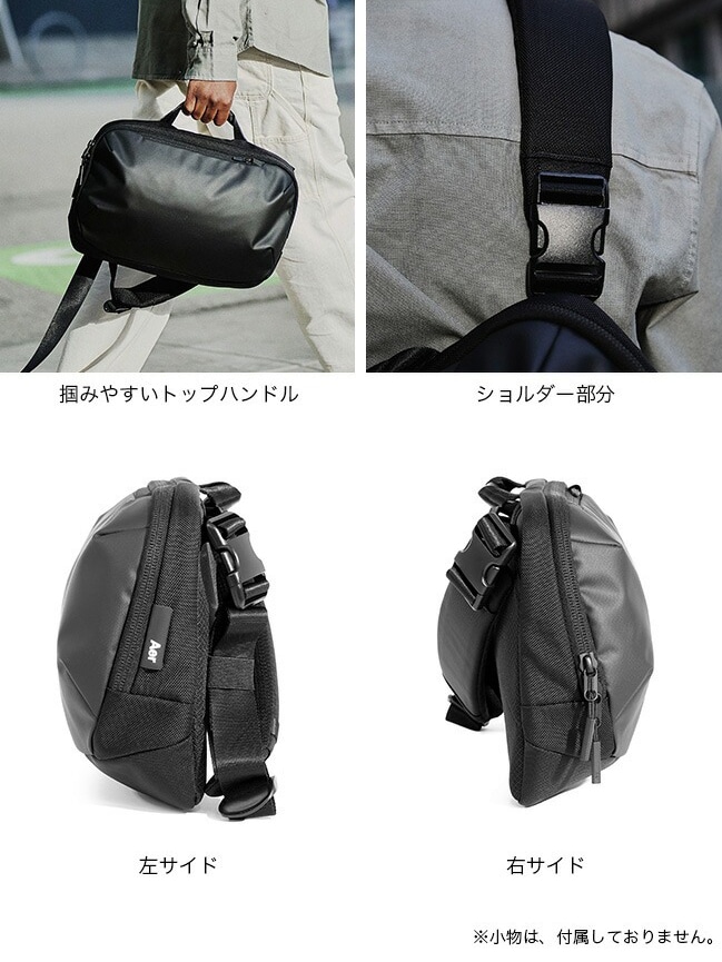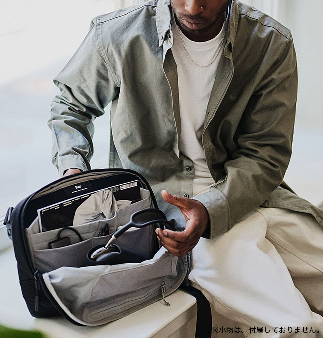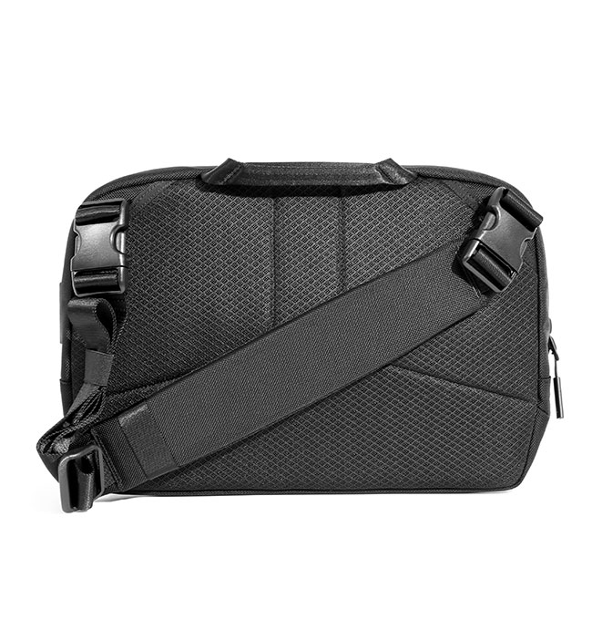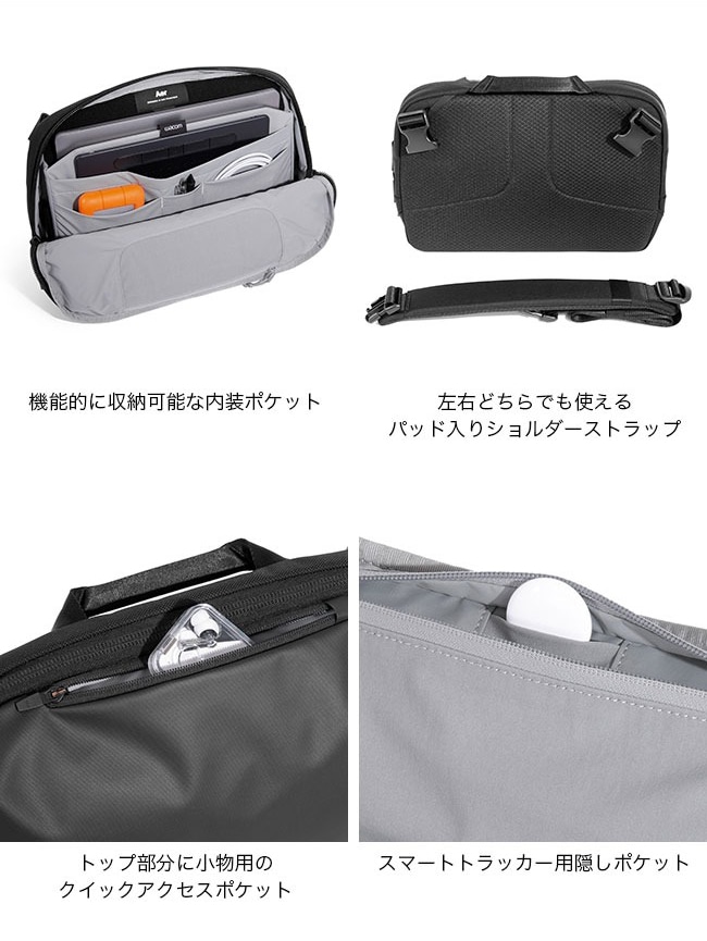 パッド入りのPC用ポケット、ギアを収納できる複数のポケット、左右どちらでも使えるリバーシブルのショルダーストラップが特徴です。