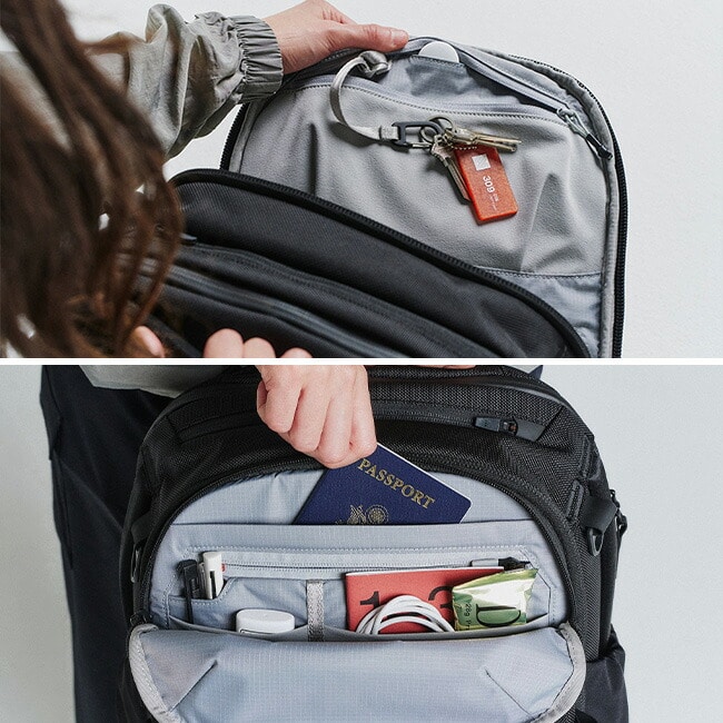 フロントポケットやトップポケットはクイックアクセス設計で、スマートフォンや小物をすぐに取り出せます。
