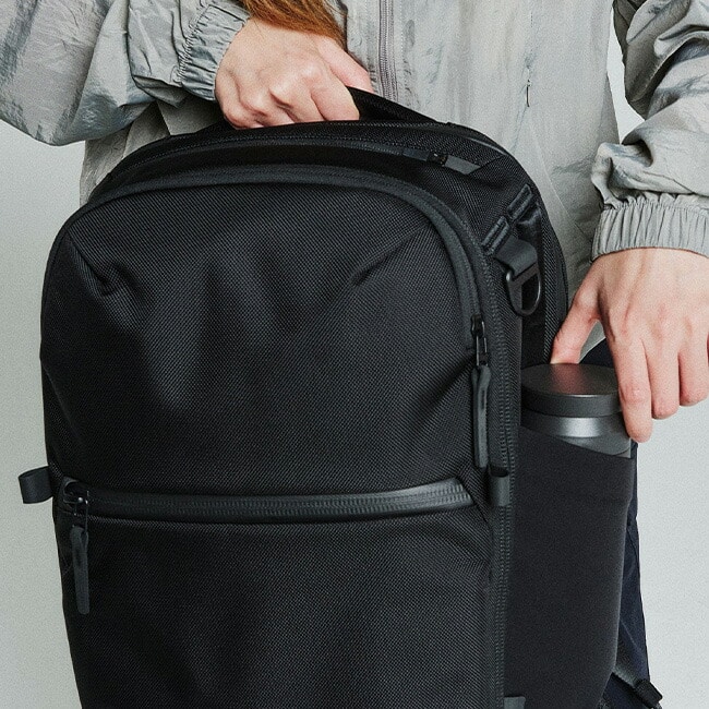 外側にはウォーターボトルポケットを備え、グラブハンドルによってさまざまな持ち運びスタイルにも対応します。
