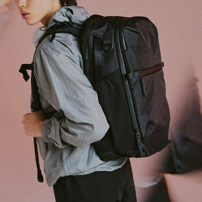 コンパクトながら高い耐久性と収納力を兼ね備えたトラベルバックパック。