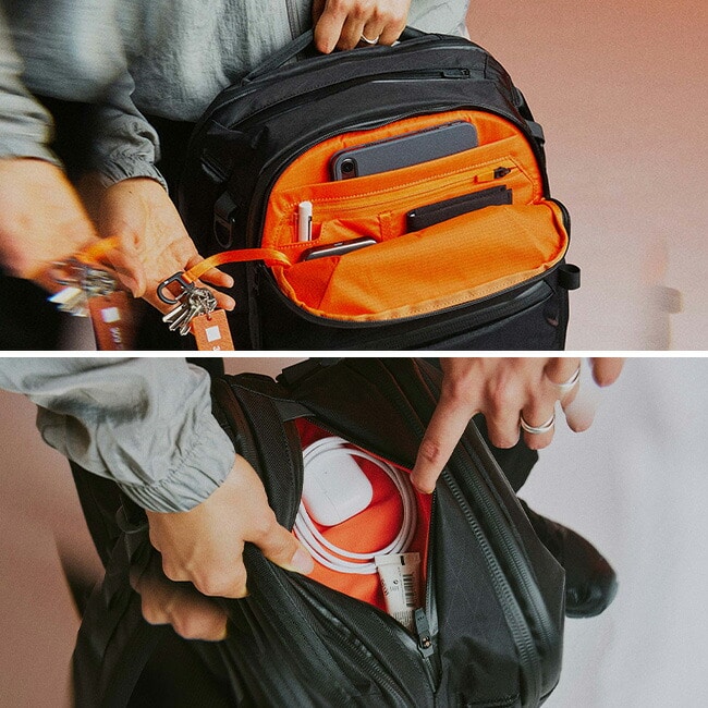 フロントポケットやトップポケットはクイックアクセス設計で、スマートフォンや小物などをすぐに取り出すことが可能です。