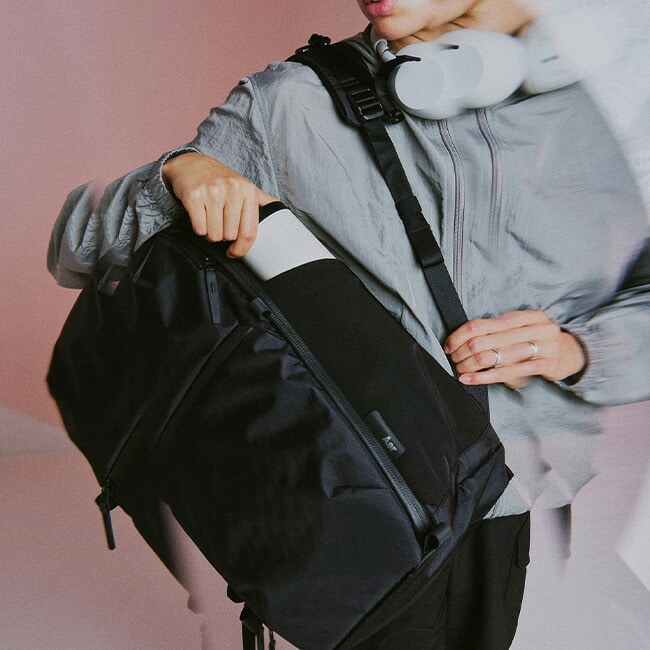 外側にはウォーターボトルポケットを配置し、グラブハンドルにより多彩な持ち運びにも対応します。
