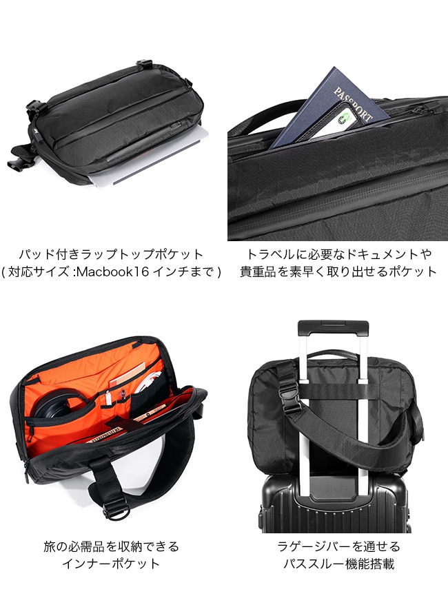 パッド付きのラップトップ用ポケット、旅を含む様々なシーンの必需品を収納できる内部のポケットが備わり、目的に応じて多様な持ち方が可能なスリングストラップがついています。