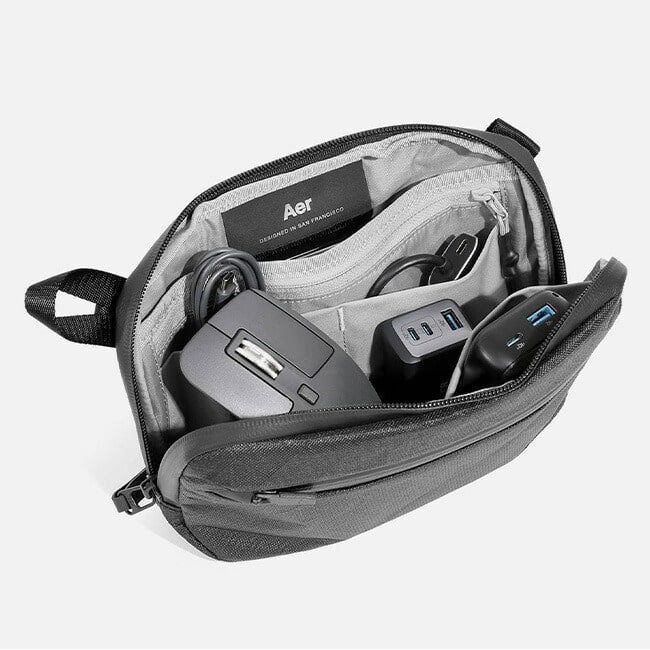内部には伸縮性のある生地を使用したオーガナイザーやジップ付きインナーポケットを配置し、小物やアクセサリーを整理して収納できます。