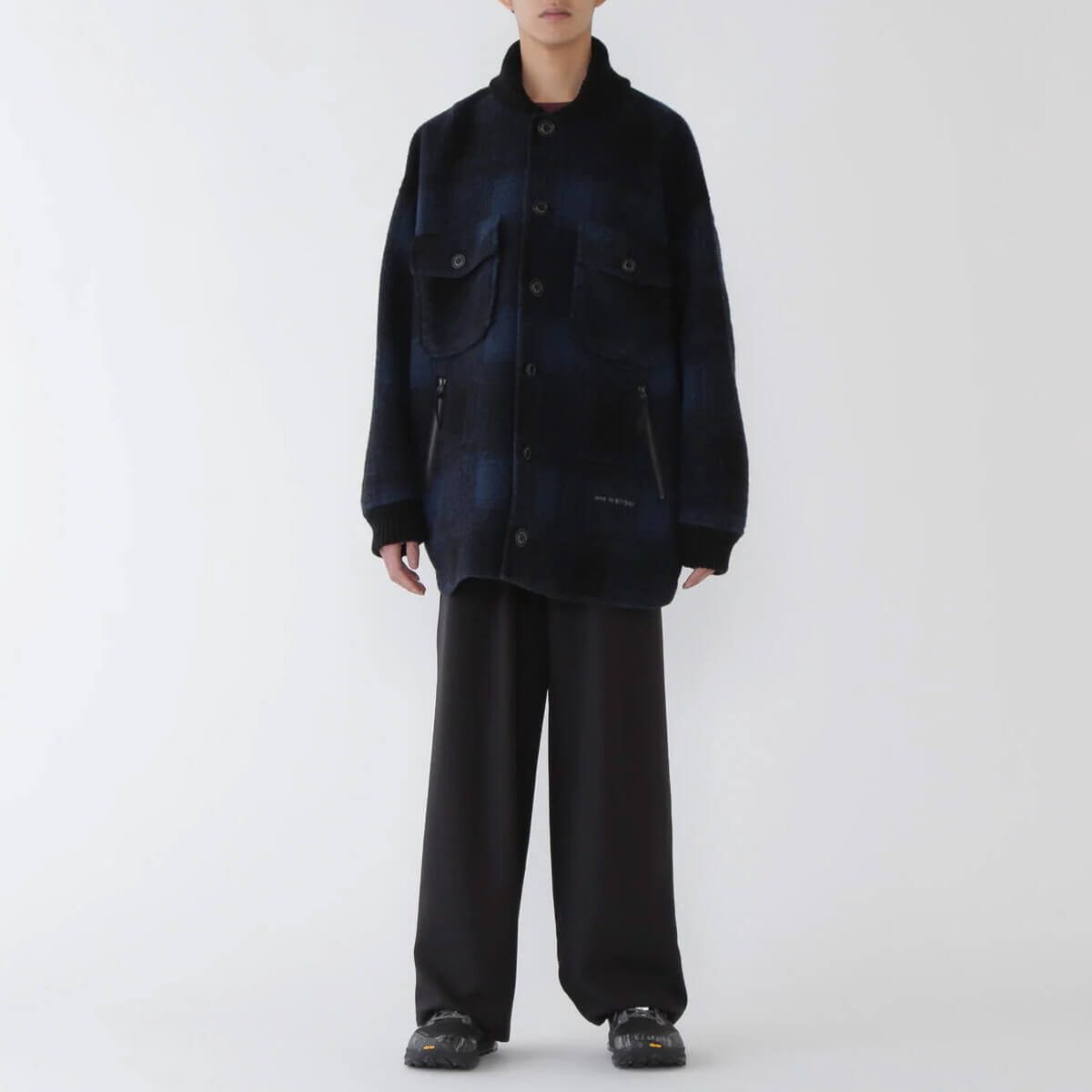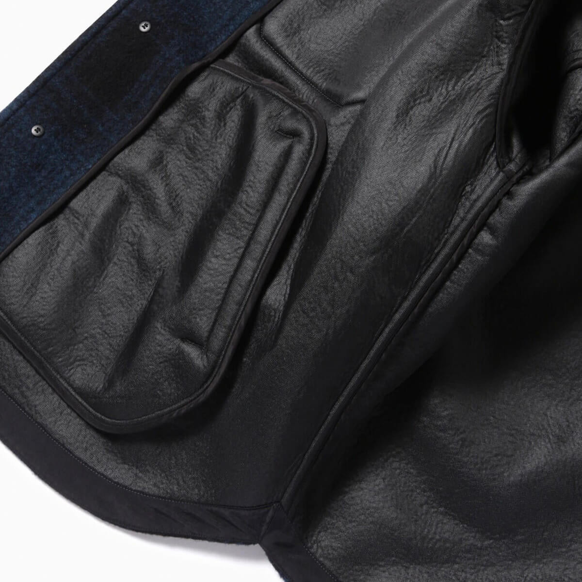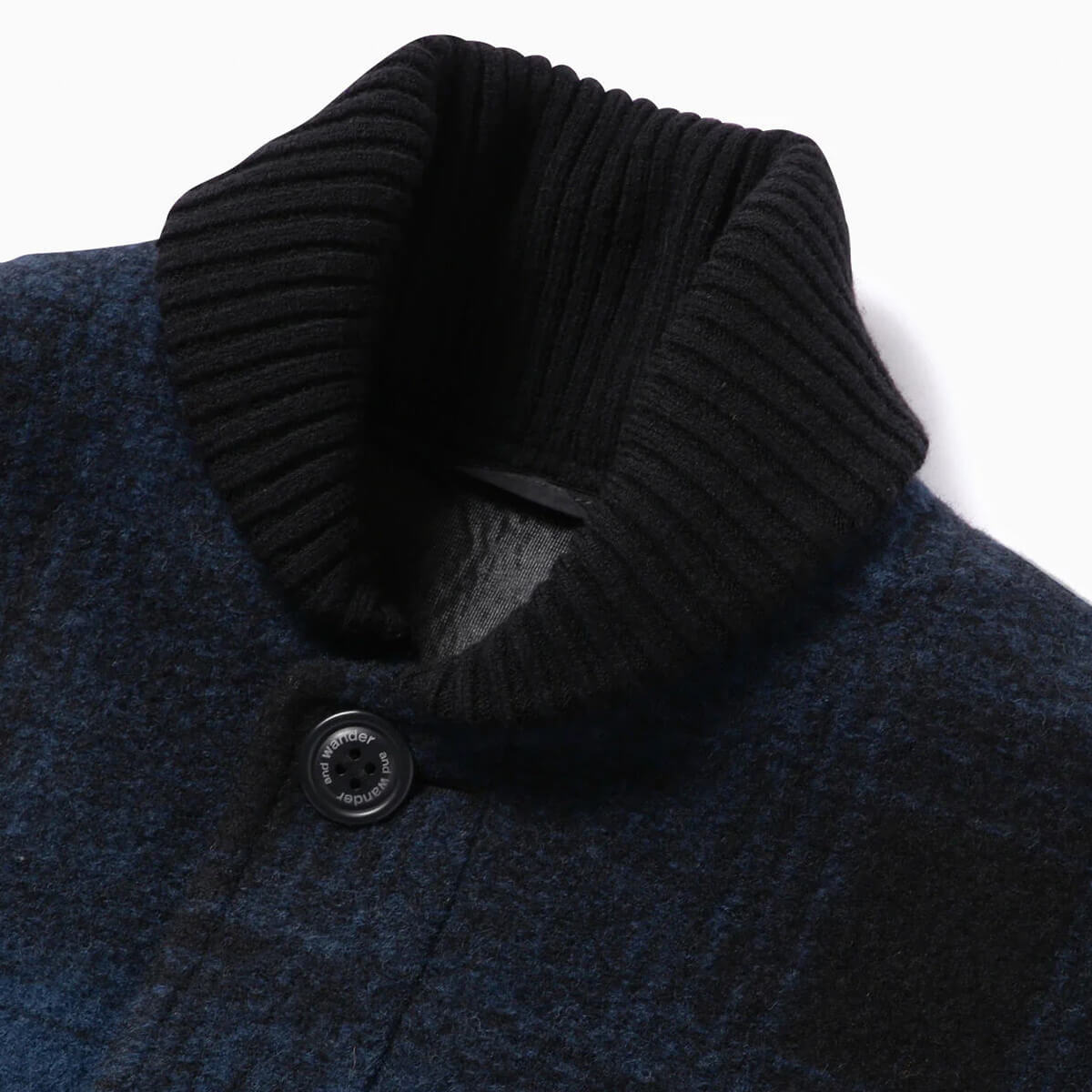 高い防風性を持つ、オリジナルのチェック柄素材のロングジャケット。