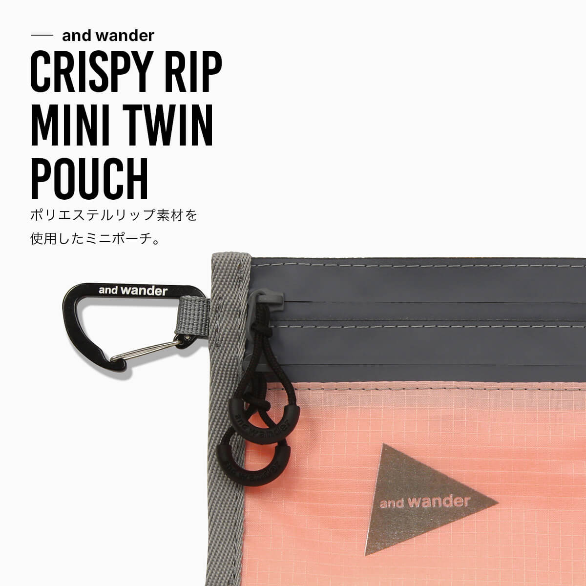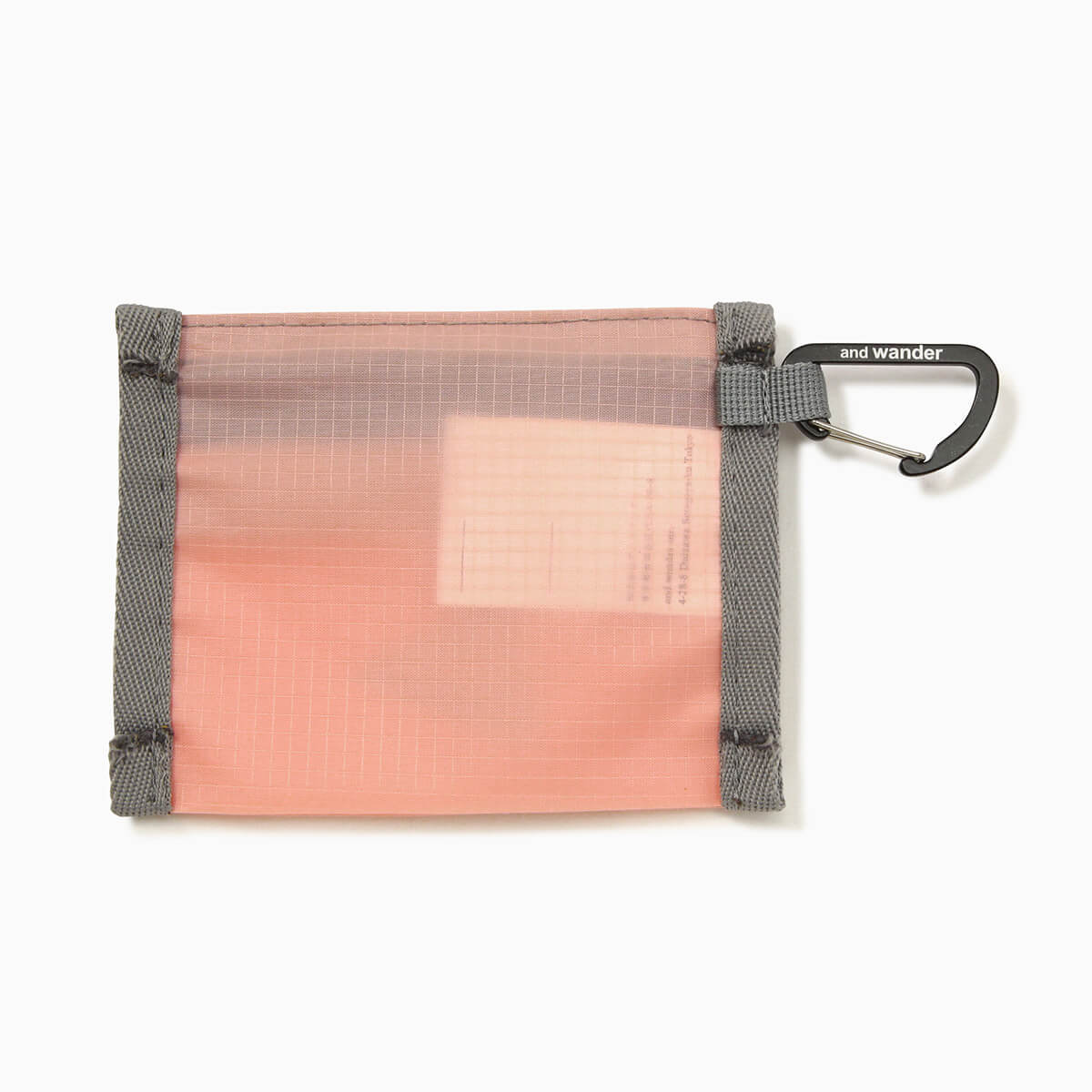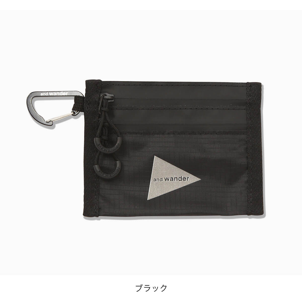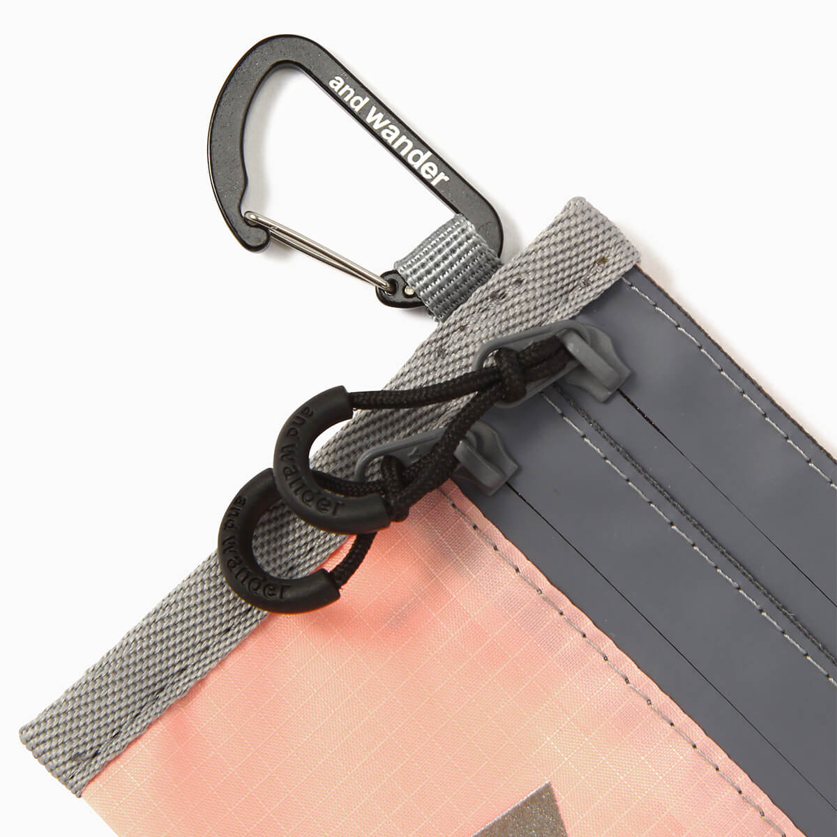薄手で軽量なリサイクルリップストップ素材を使用したミニポーチ。ブランドロゴ入りのカラビナ付きです。
