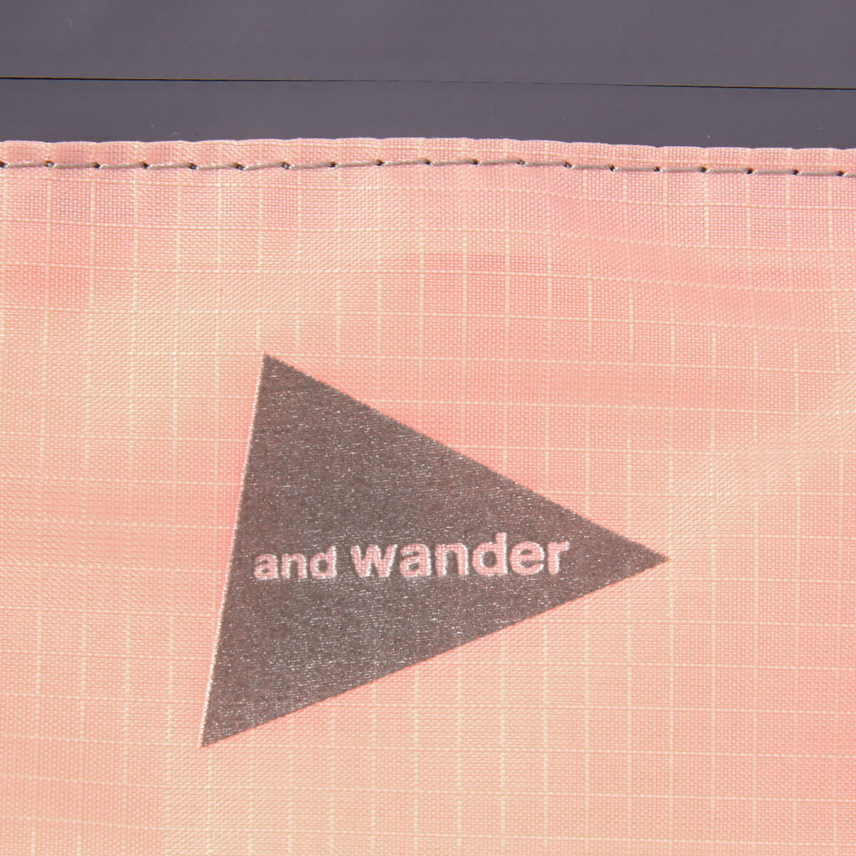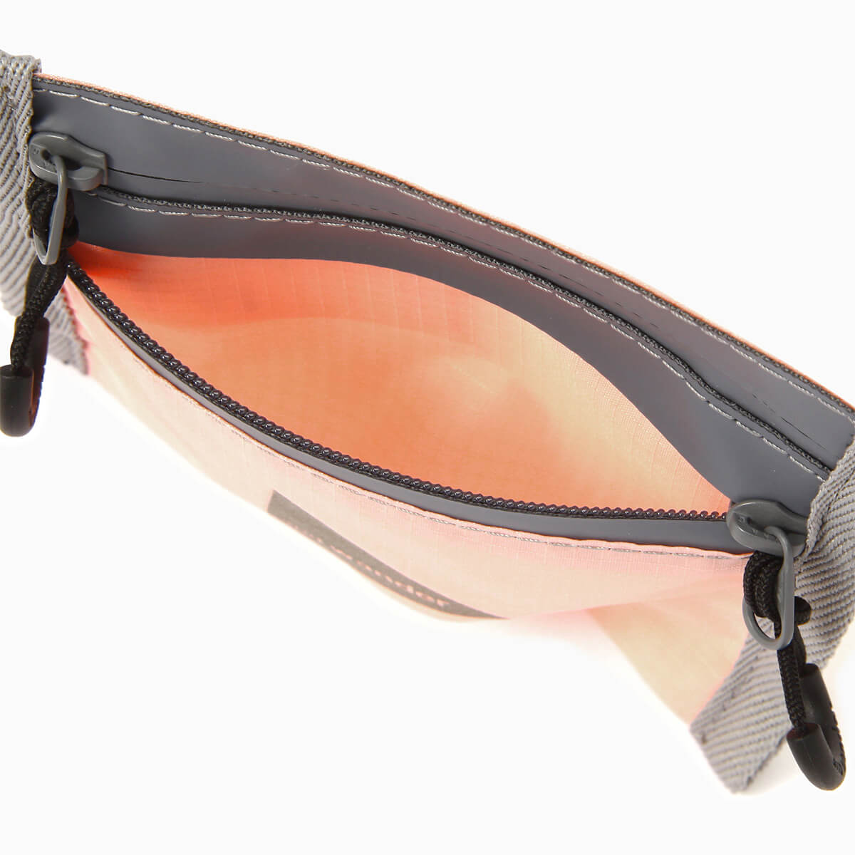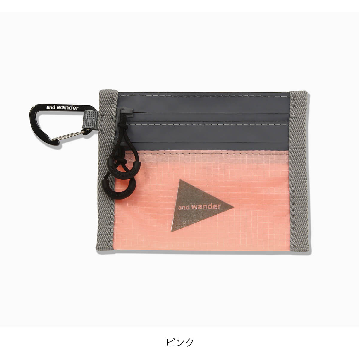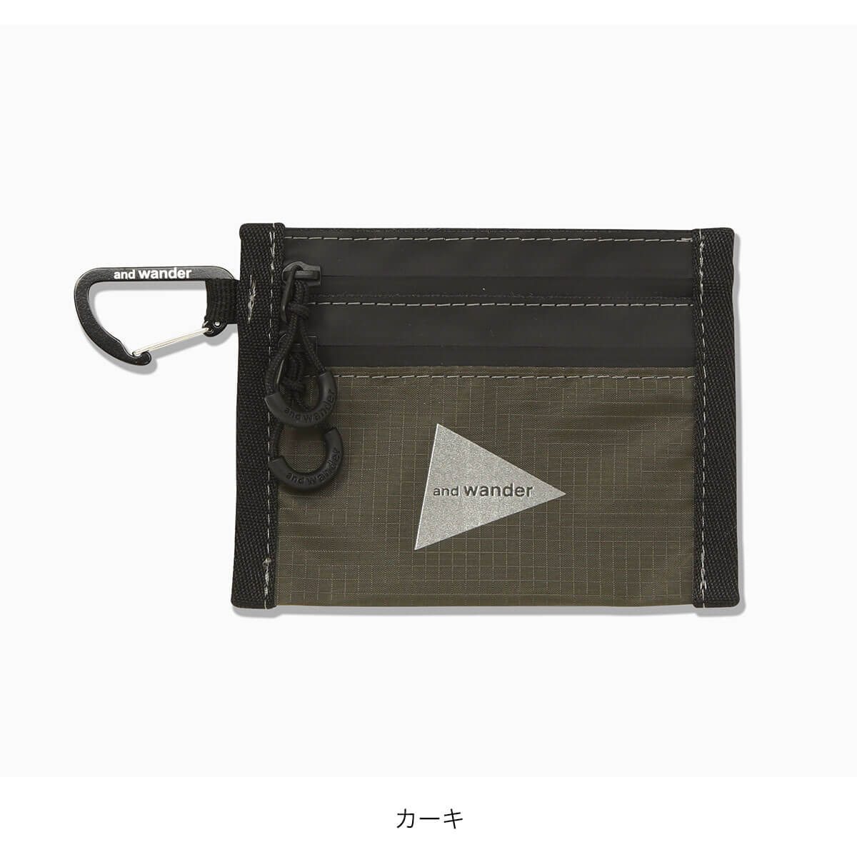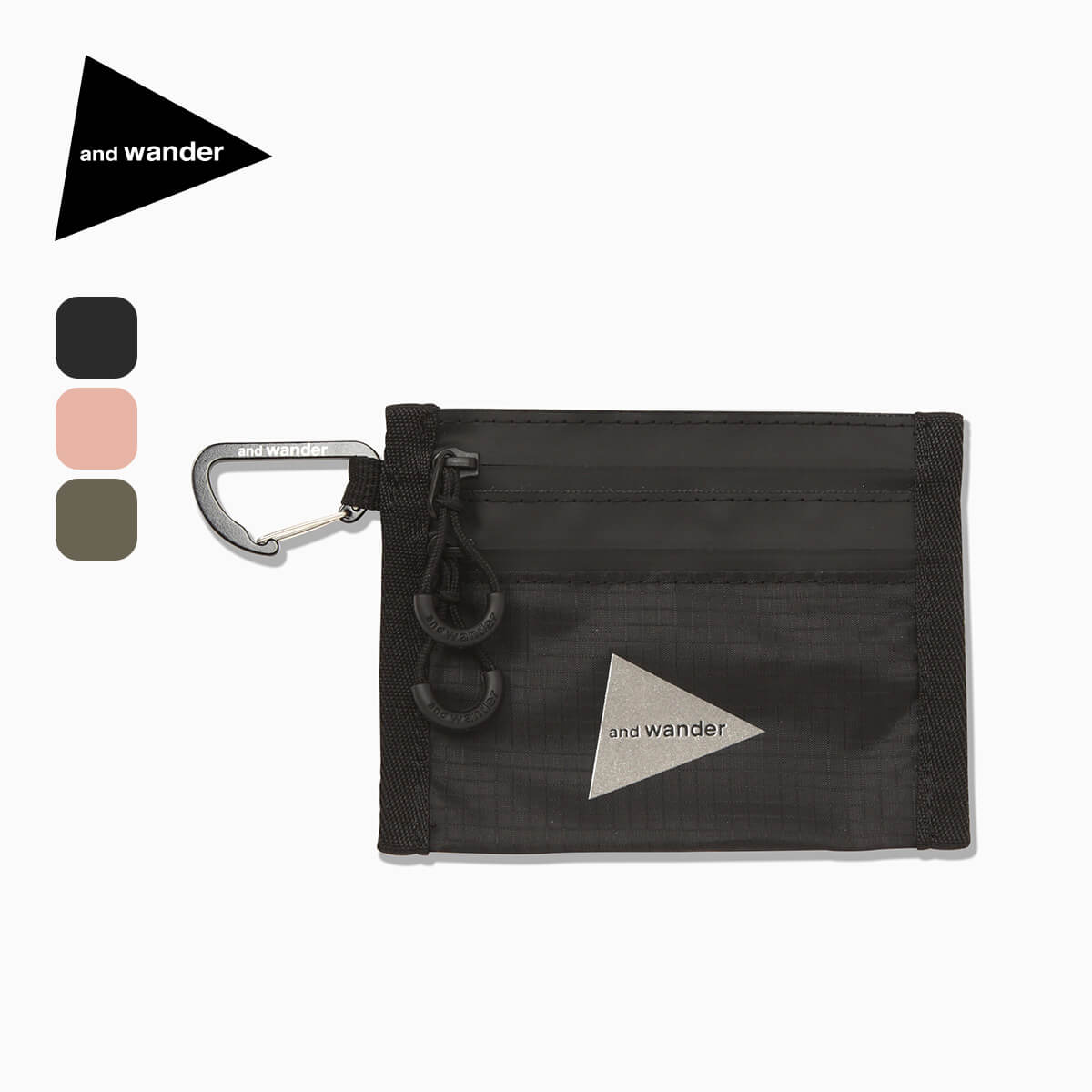 薄手で軽量なリサイクルリップストップ素材を使用したミニポーチ。ブランドロゴ入りのカラビナ付きです。