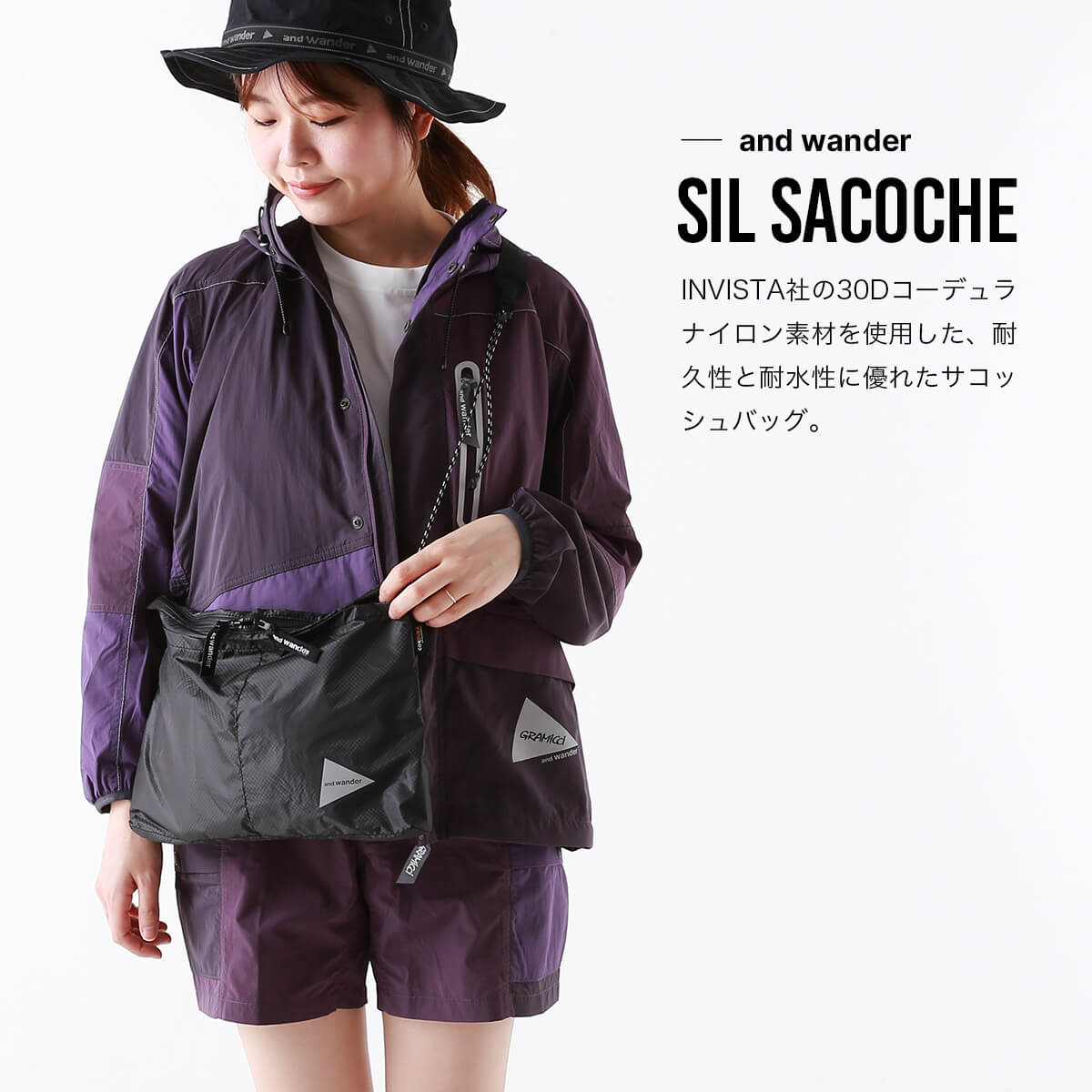 INVISTA社の30Dコーデュラナイロン素材を使用しており、摩耗、引き裂き、すり切れに強く、シリコンコーティングによる優れた撥水性と1000mm以上の耐水性能をもちます。行動中に必要な物を手元に下げておくためのサコッシュバッグです。