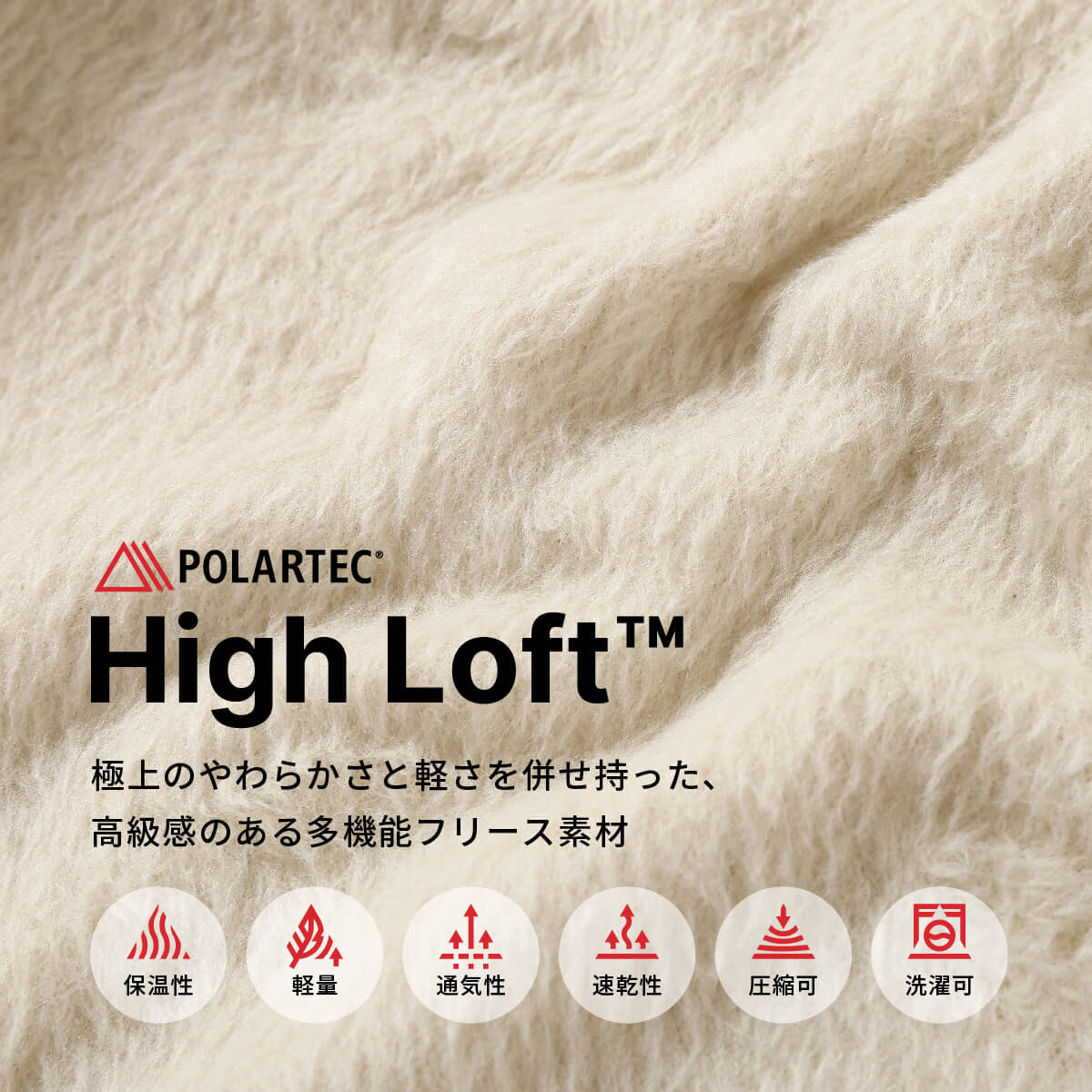 POLARTEC社のハイロフトフリースは軽くて保温性と通気性に優れた素材です。裾のドローコードでフィット感を調整できます。