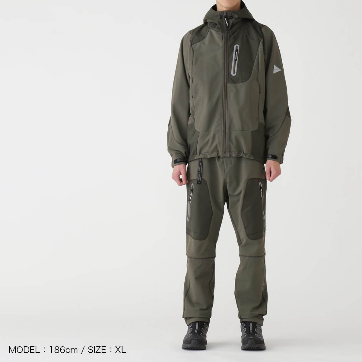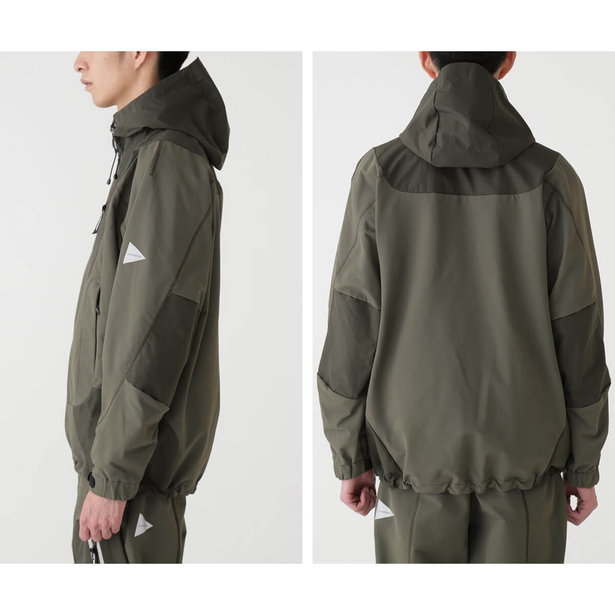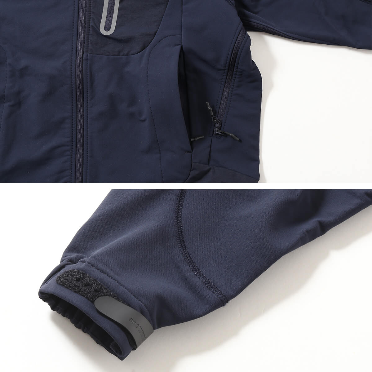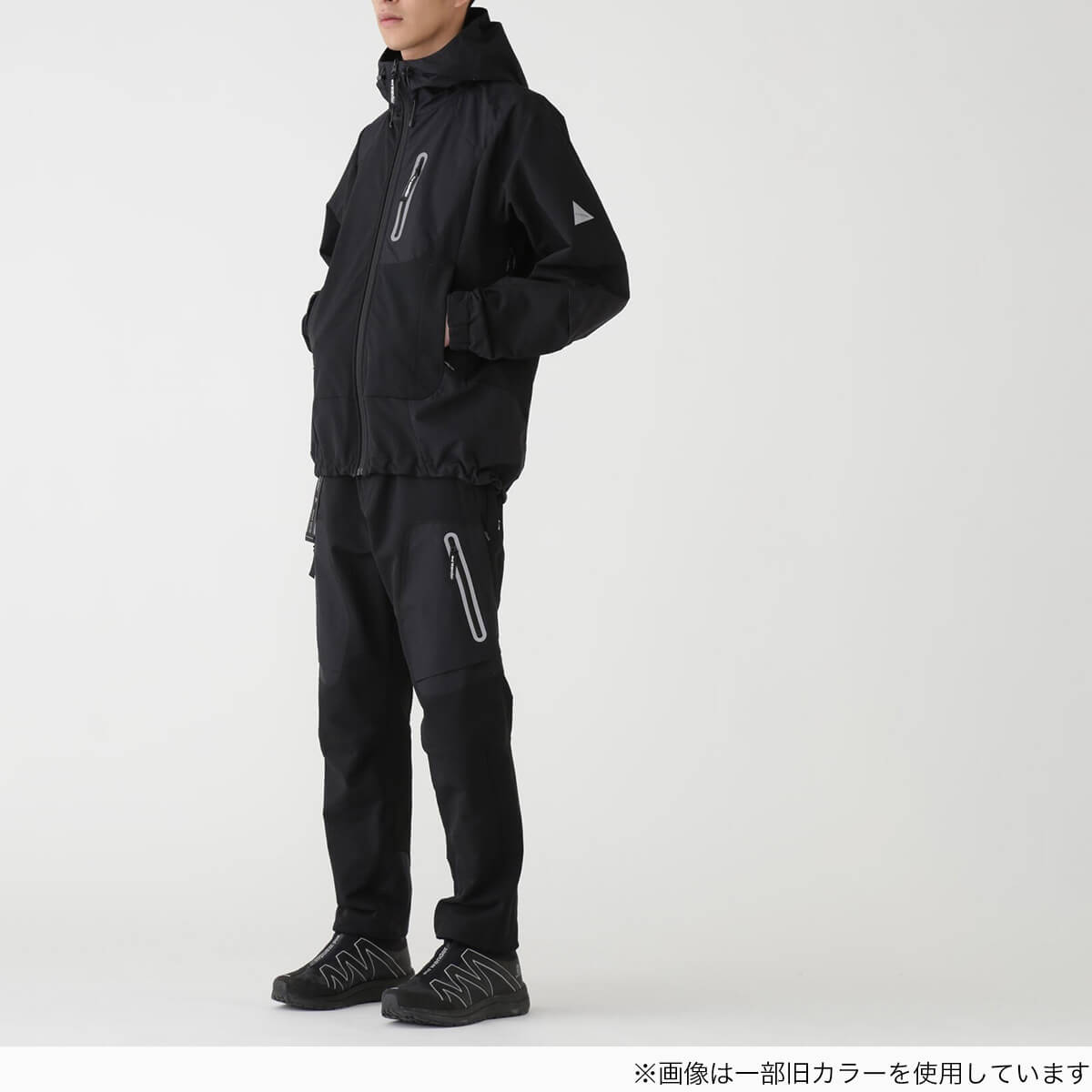 裏面を起毛したストレッチ二重織撥水素材を使用し、着用で負担のかかる肩や肘、腰には、透湿コーティングしたナイロン素材を使用しています。脇下のベンチレーションや稼動域の広い立体的なパターンは、活動的なシーンで快適に着用できます。