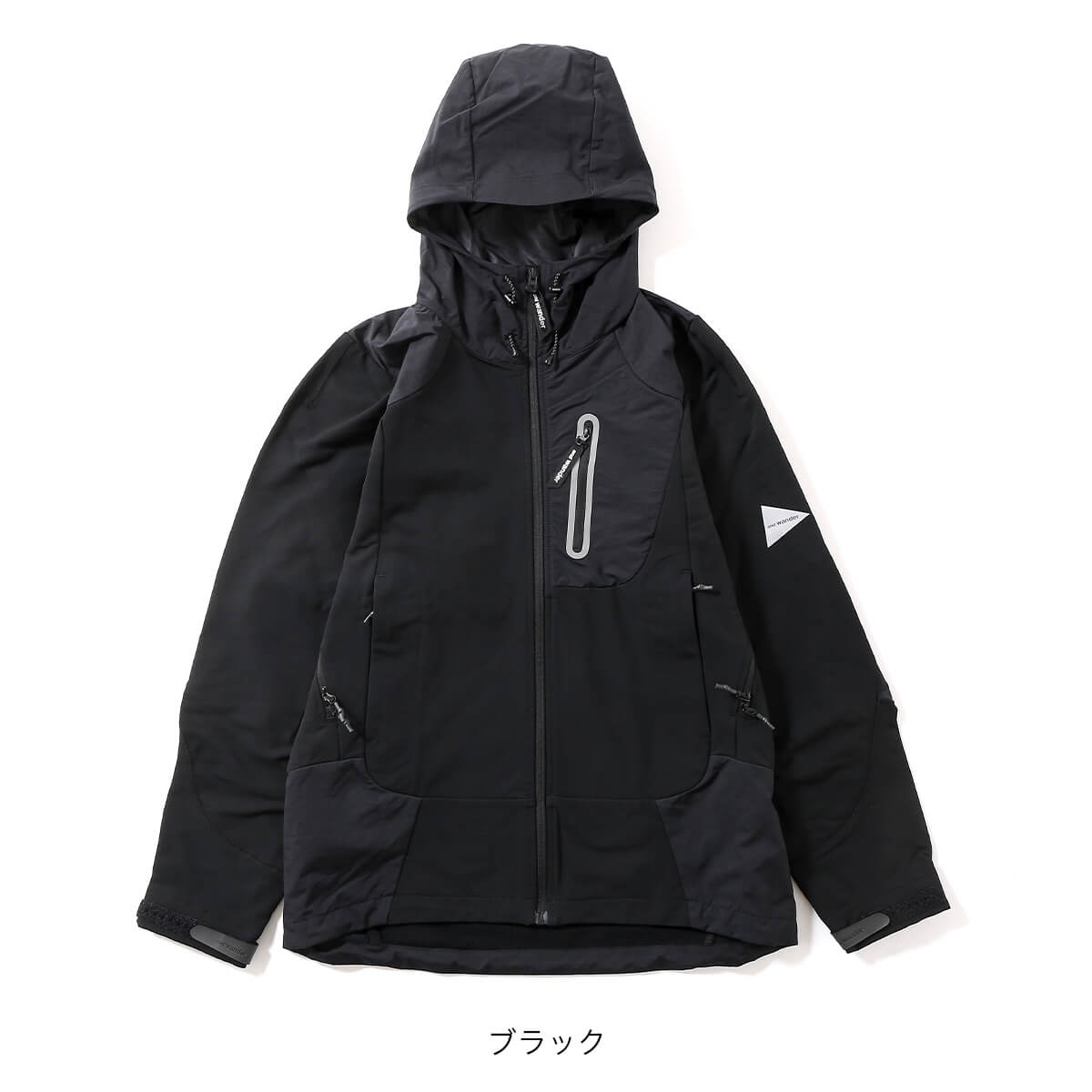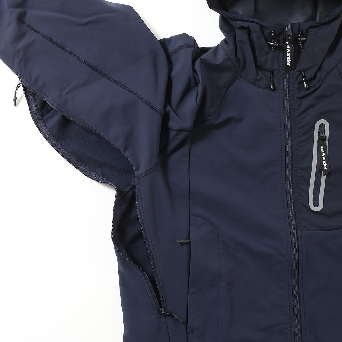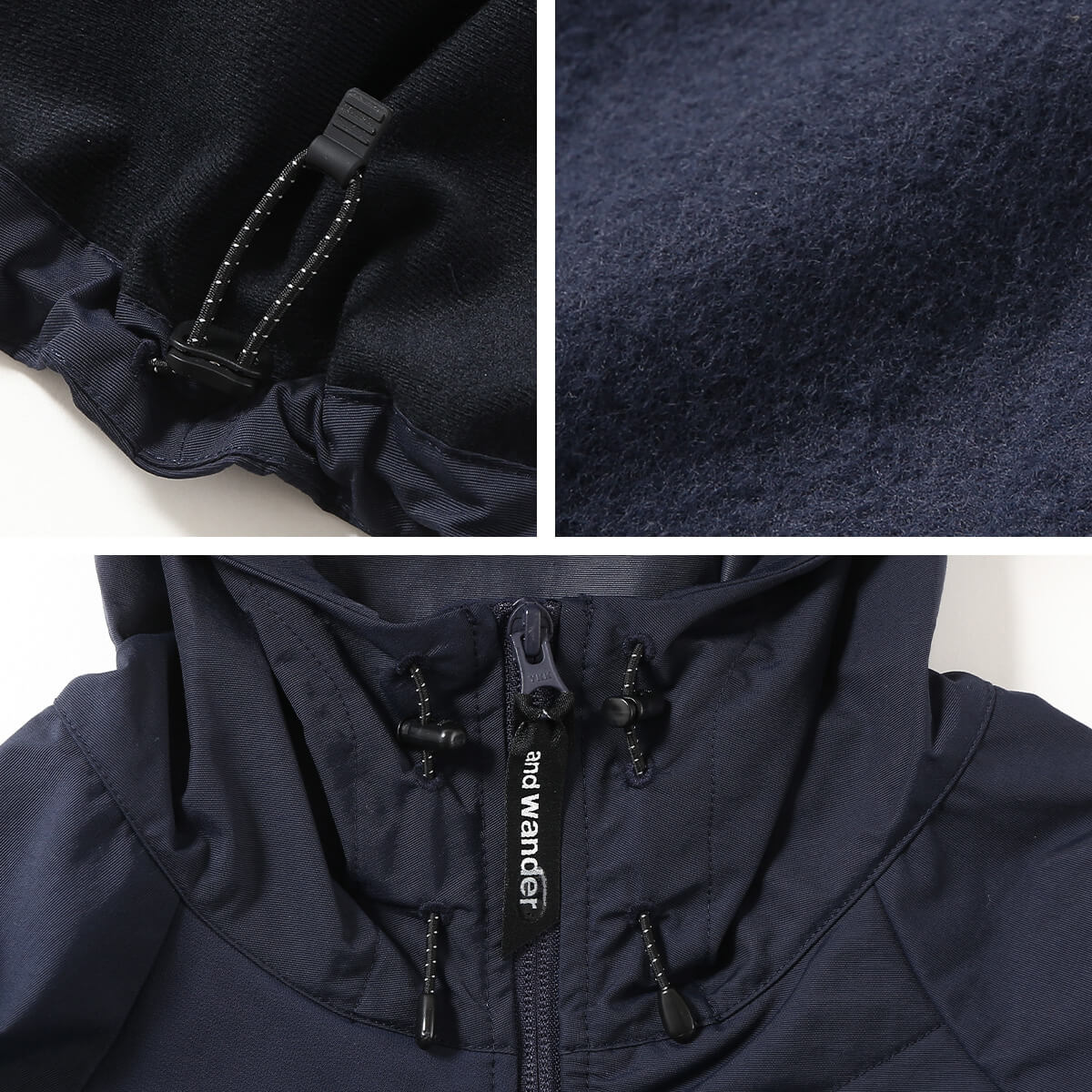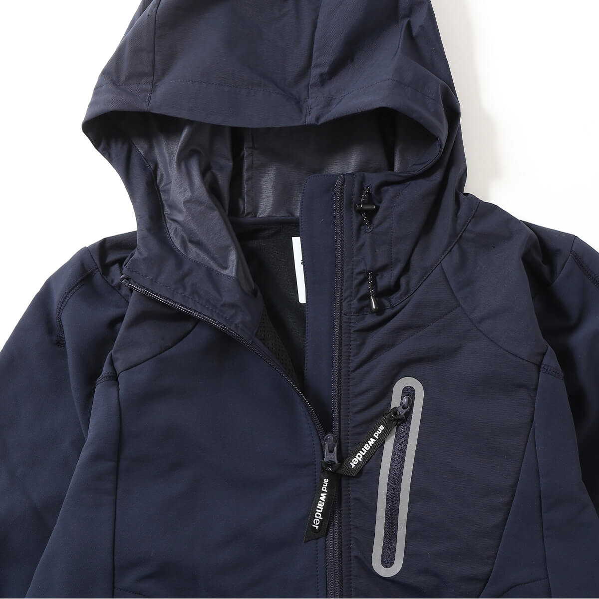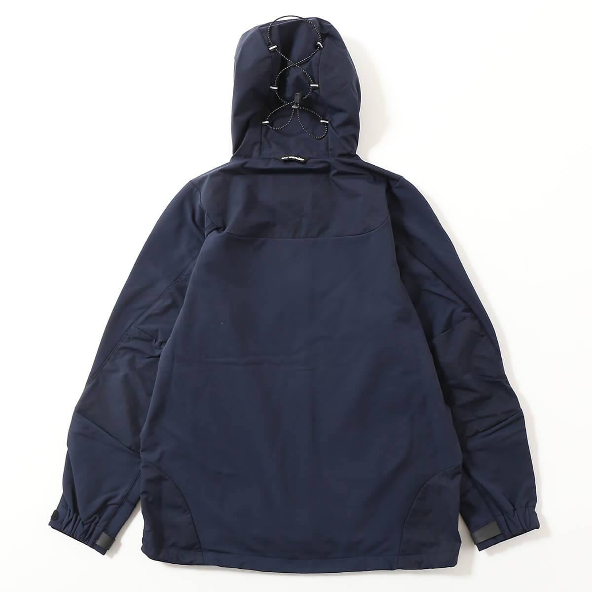 裏面を起毛したストレッチ二重織撥水素材を使用し、着用で負担のかかる肩や肘、腰には、透湿コーティングしたナイロン素材を使用しています。脇下のベンチレーションや稼動域の広い立体的なパターンは、活動的なシーンで快適に着用できます。