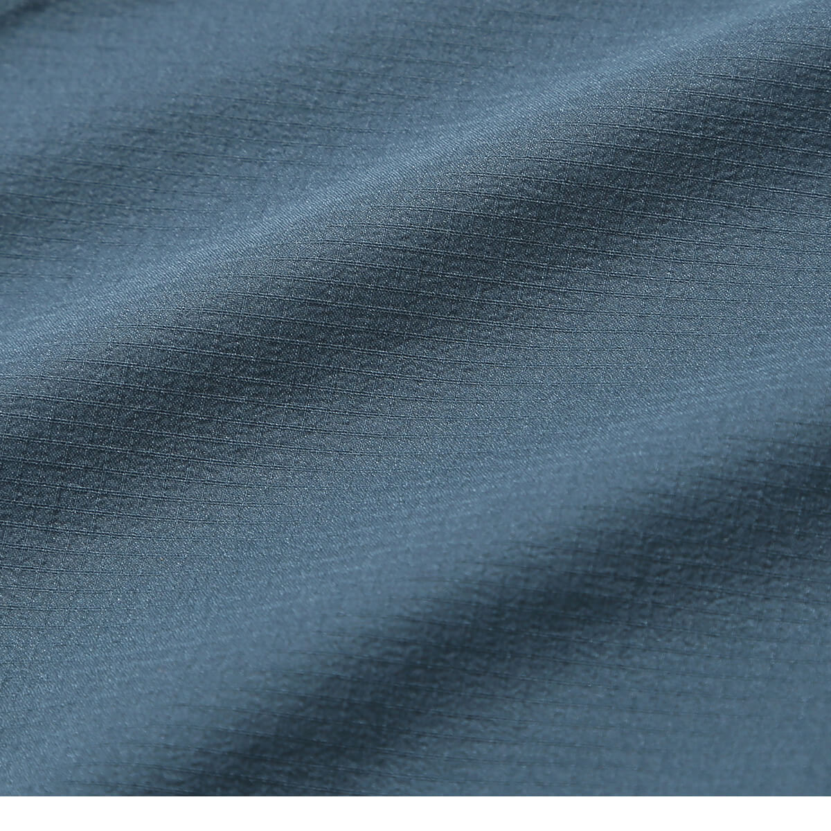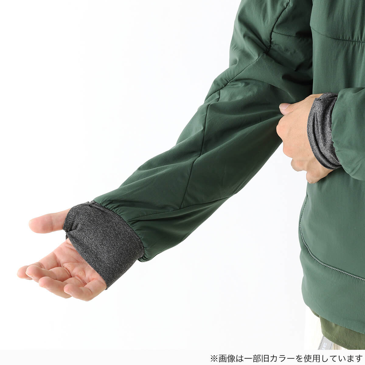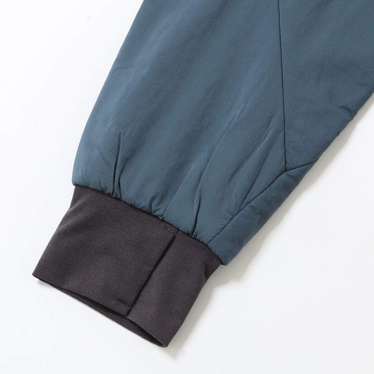POLARTEC社のALPHAは、繊維を編むことで抜け落ちることを防いだ画期的な中綿です。中綿を包む表地は30cm3/cm²・s、裏地は65cm3/cm²・s(フラジール形法ASTM D 737)の通気度の高い耐久撥水生地を使用しており、保温性は確保しながら、身体を動かすことによって発生する熱や汗をスムーズに放出します。