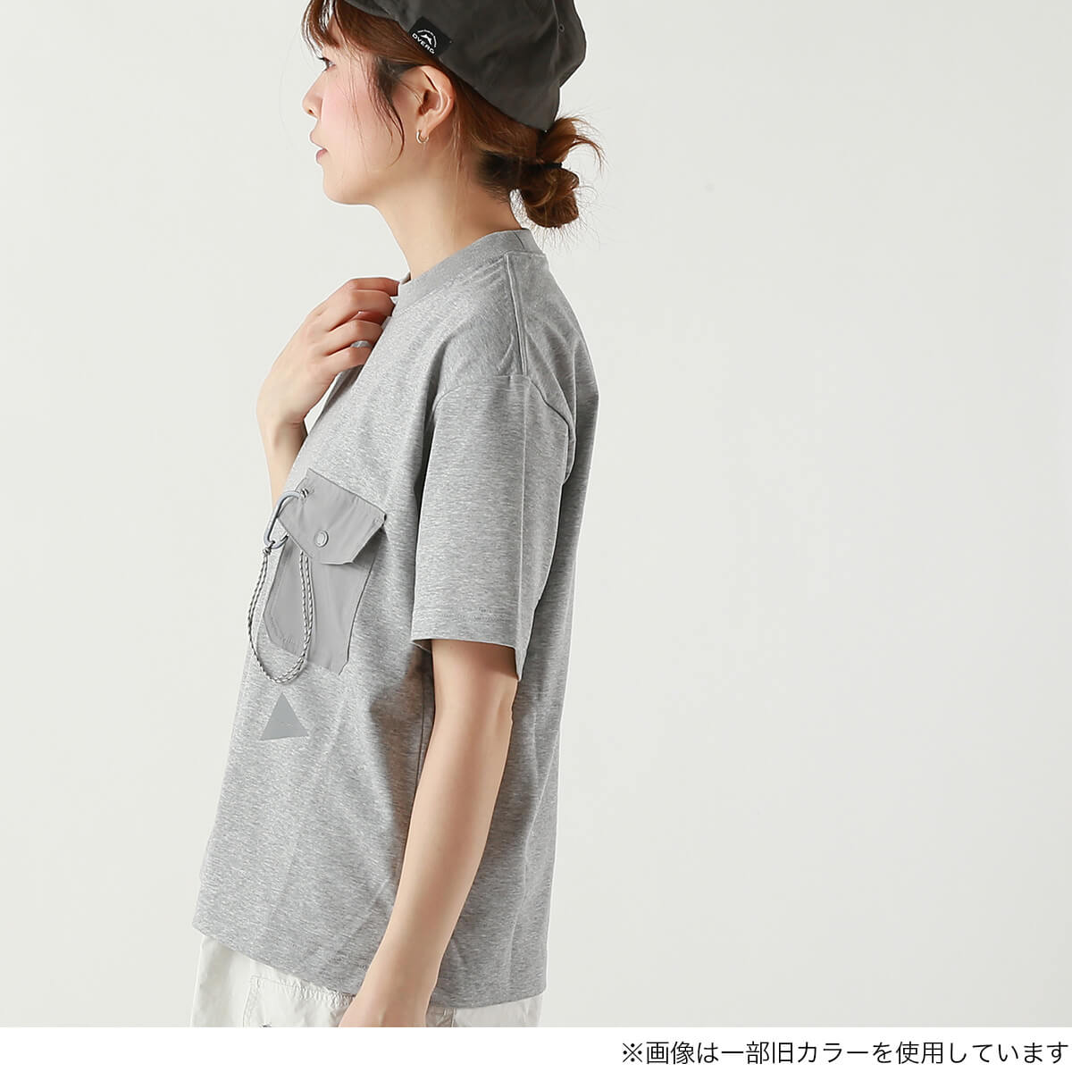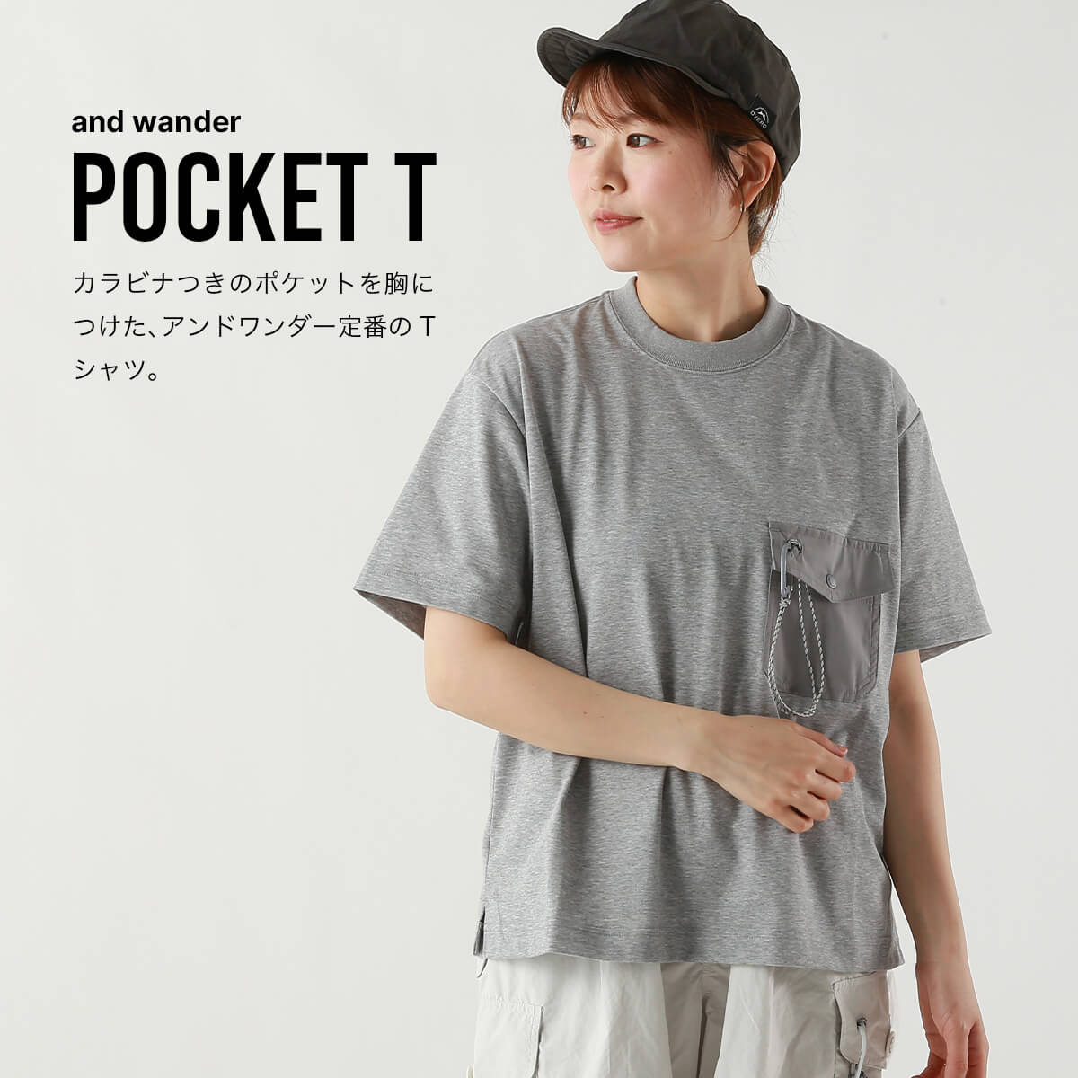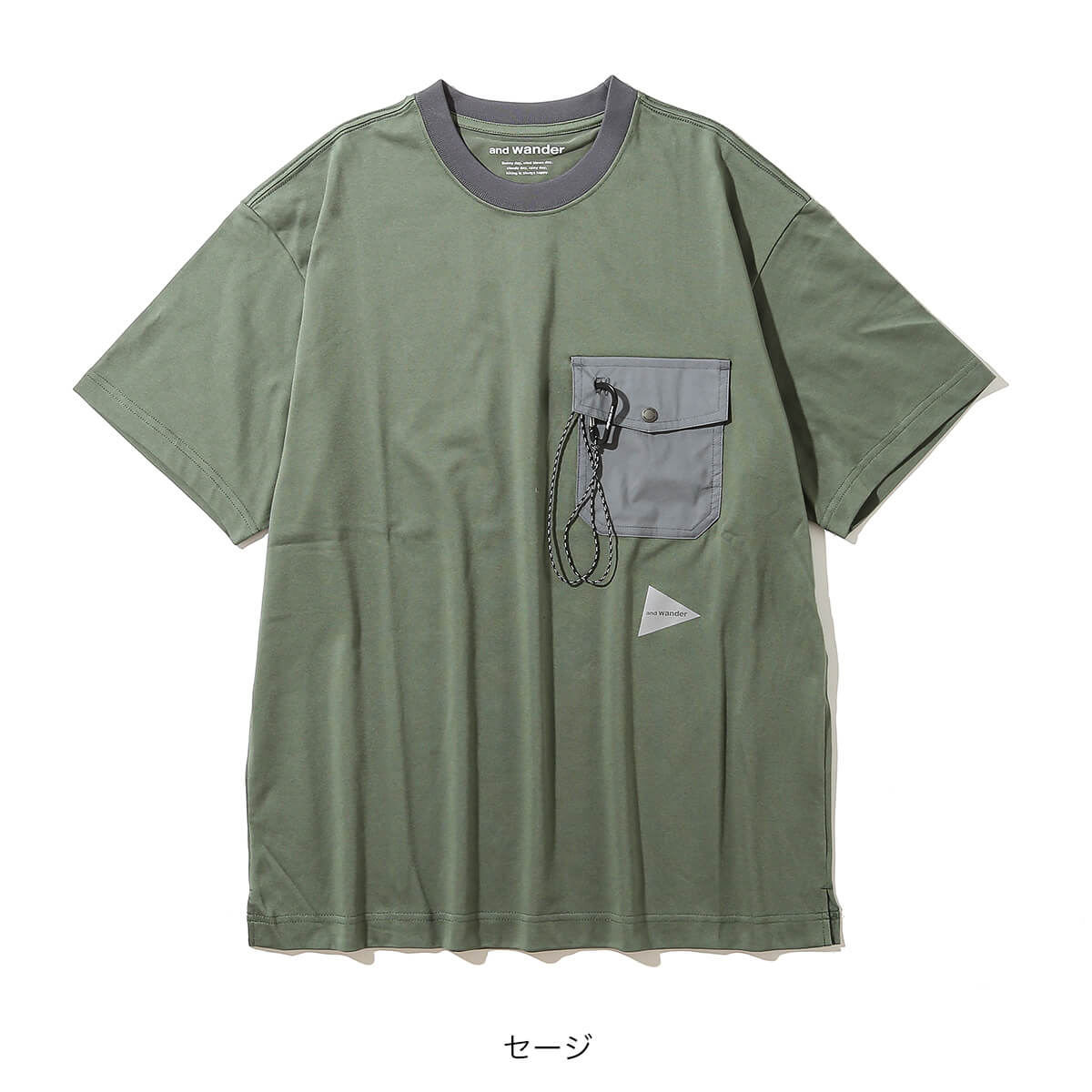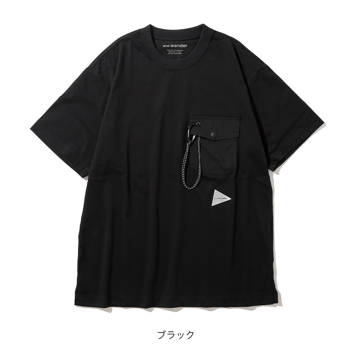 カラビナつきのポケットを胸につけた、アンドワンダー定番デザインのTシャツ
