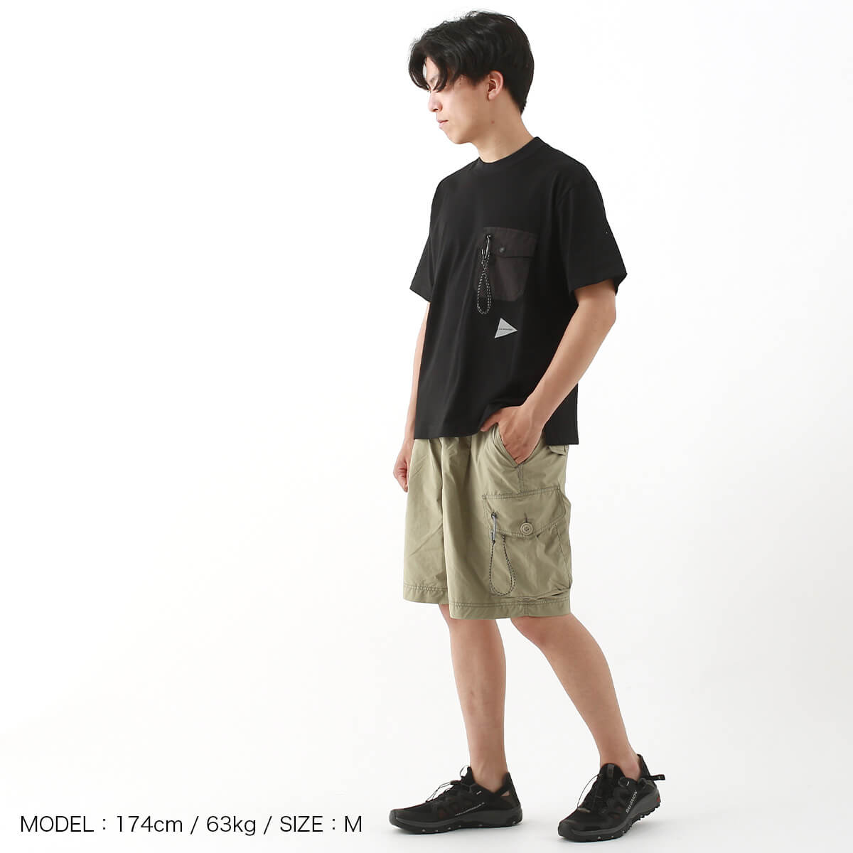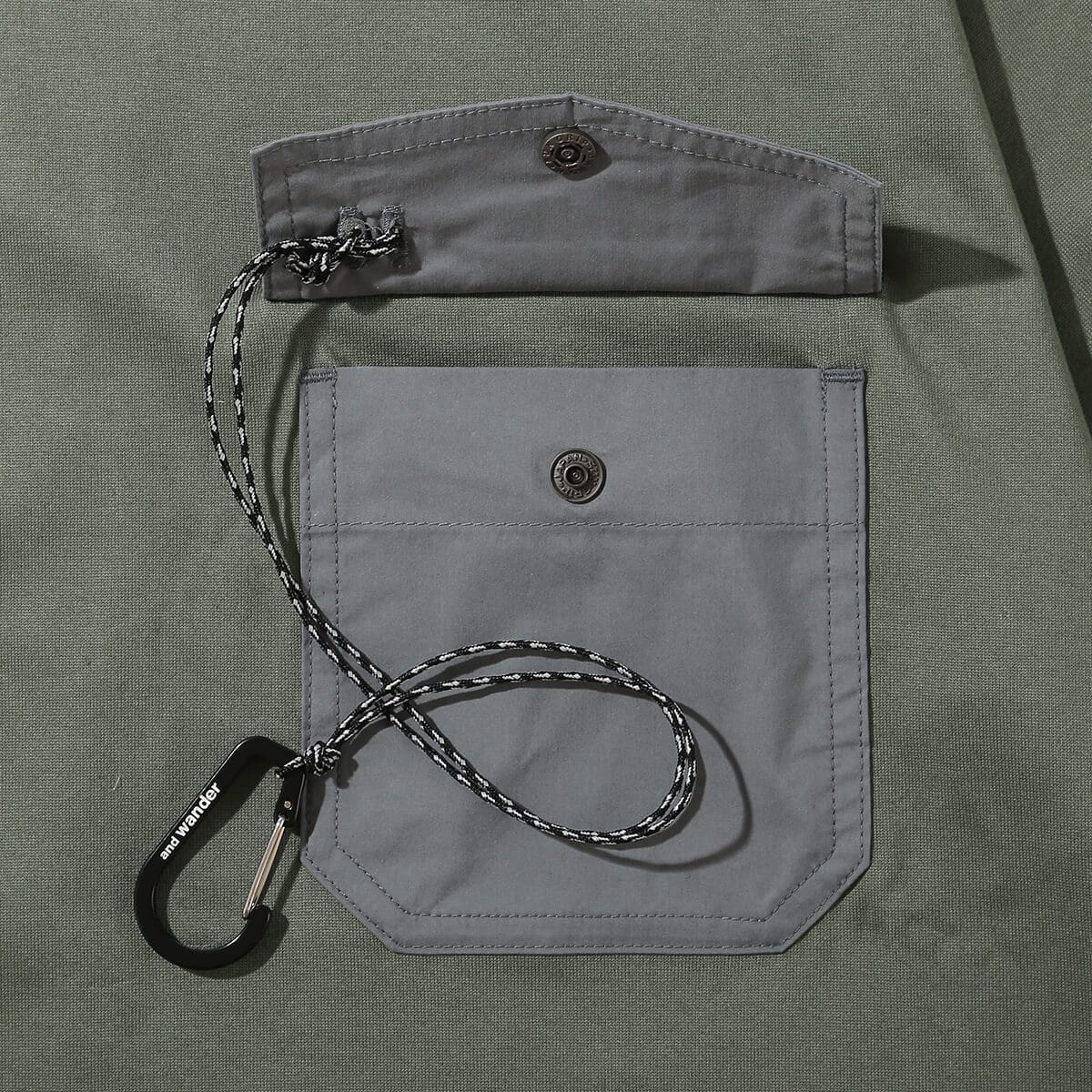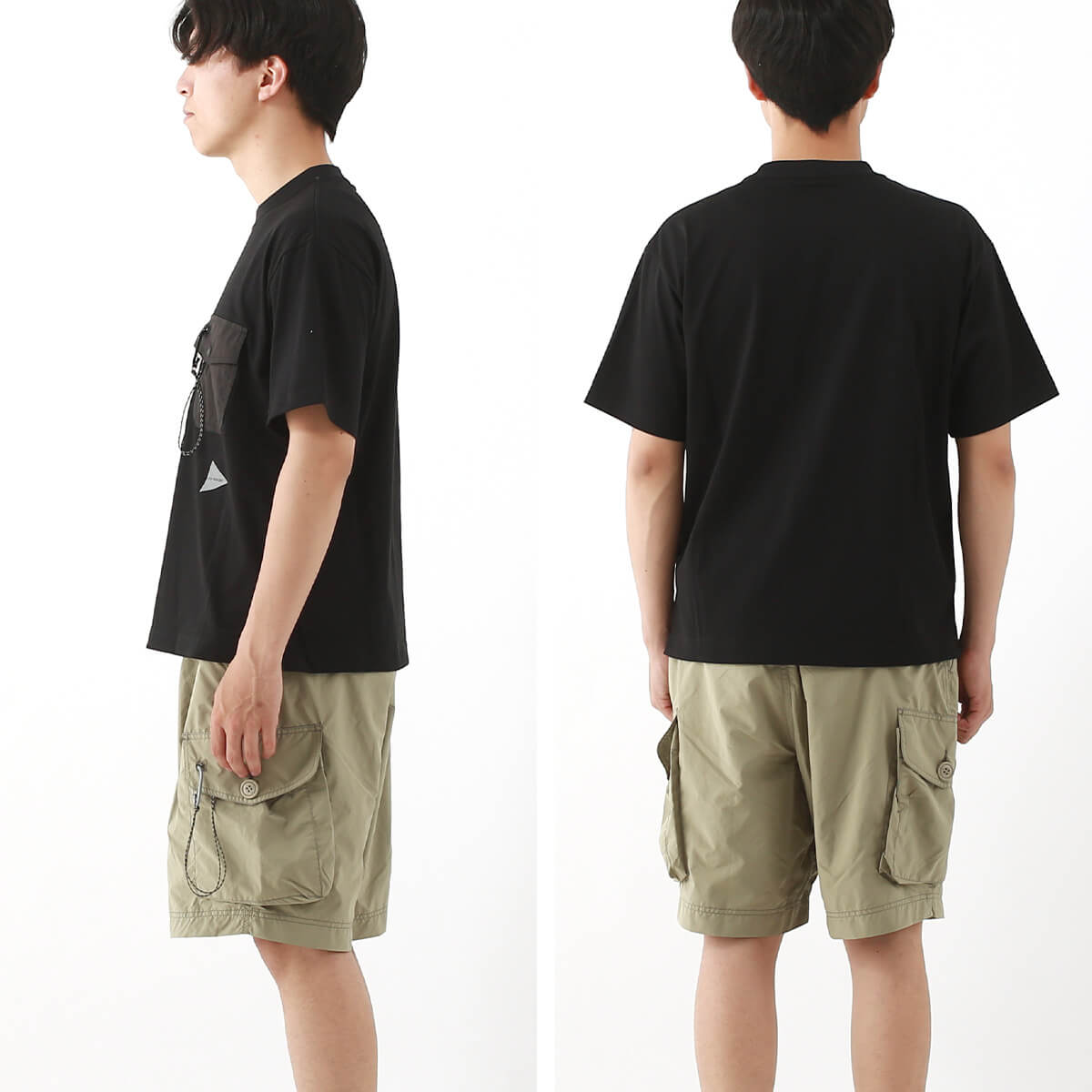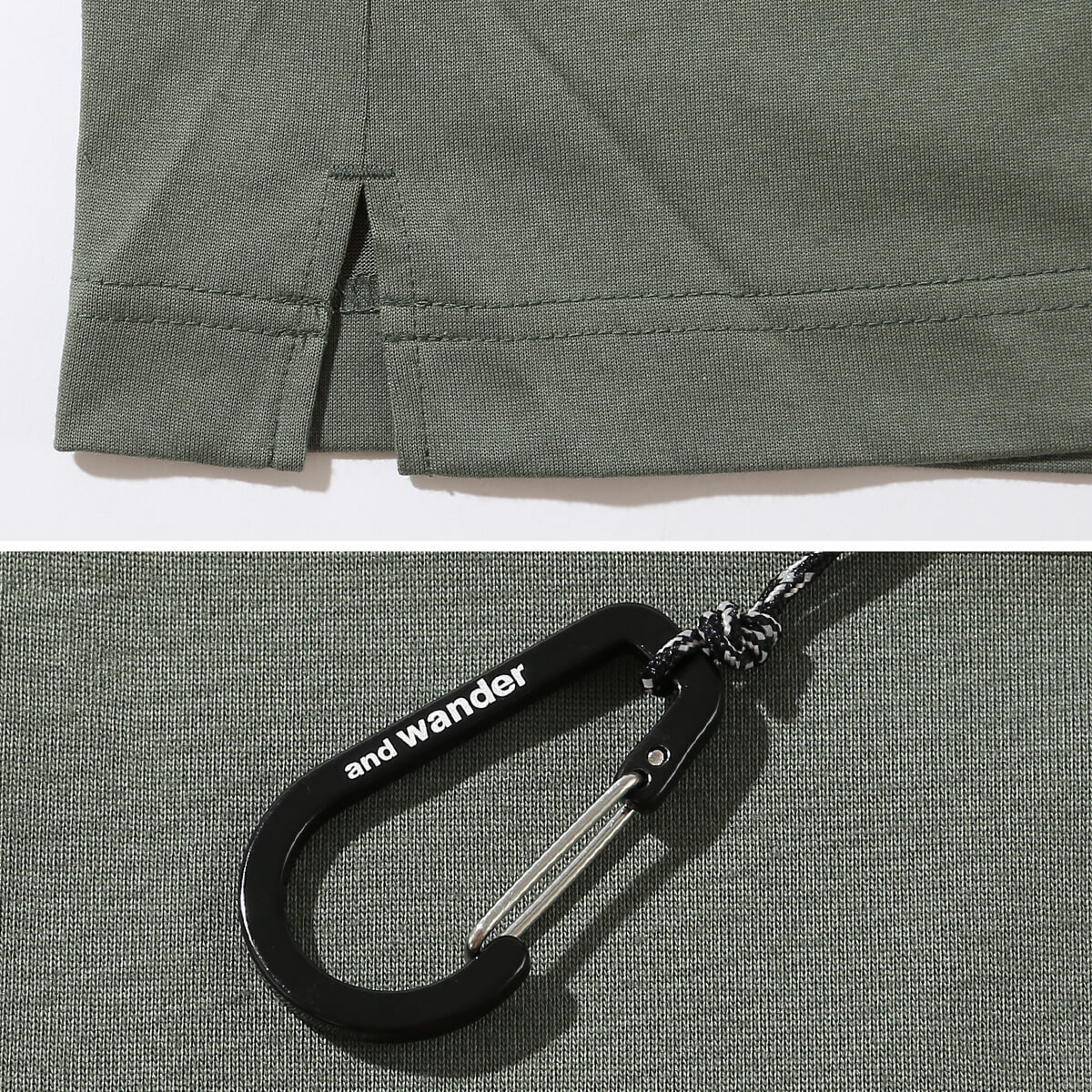 カラビナつきのポケットを胸につけた、アンドワンダー定番デザインのTシャツ