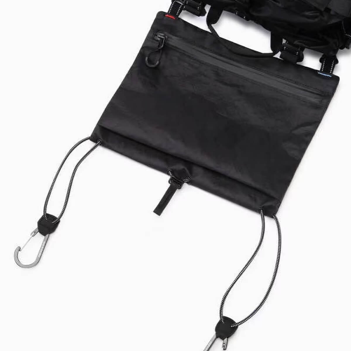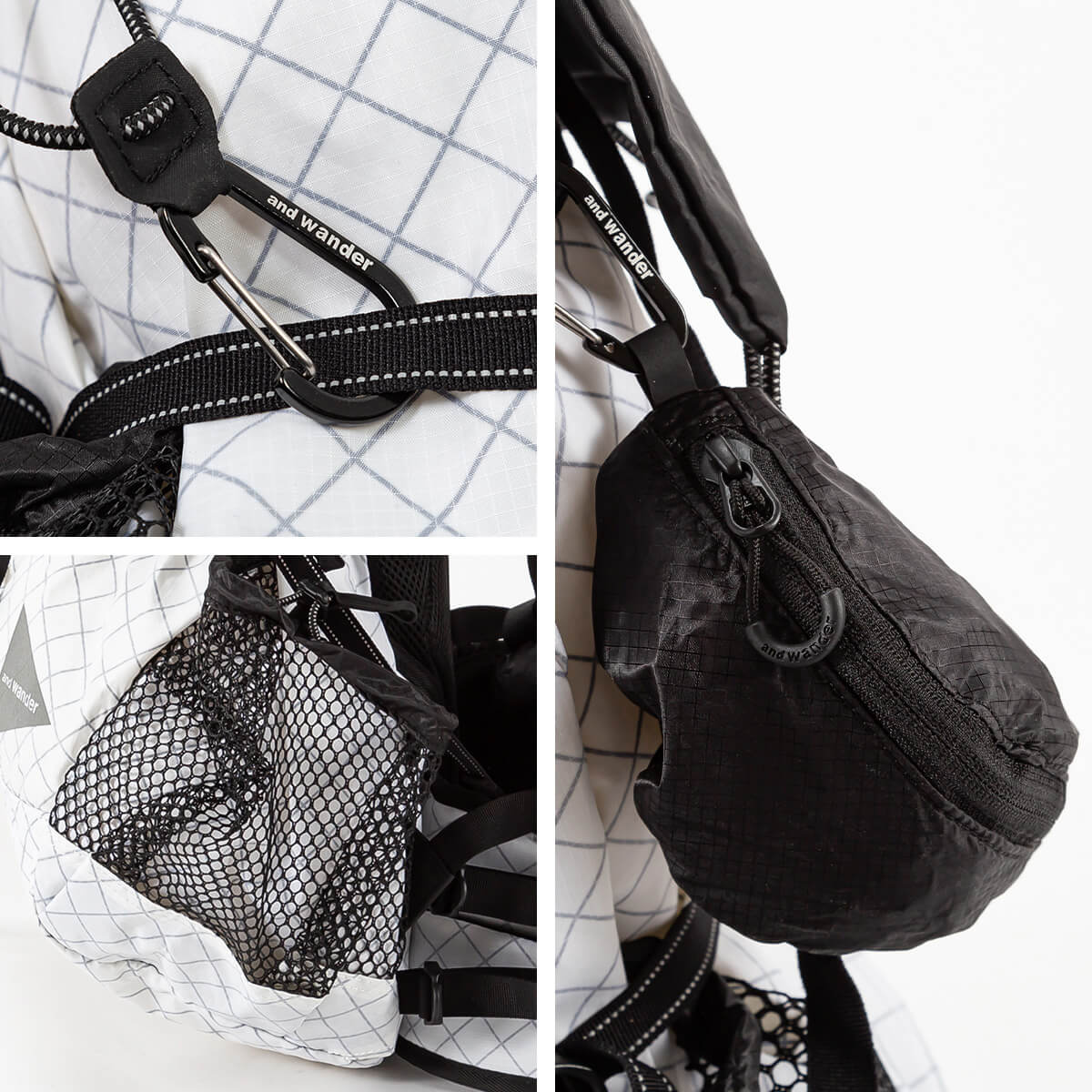 背負ったまま小物の出し入れが可能なように、ポケット機能をフロントへ集結させたレイアウトにしています。