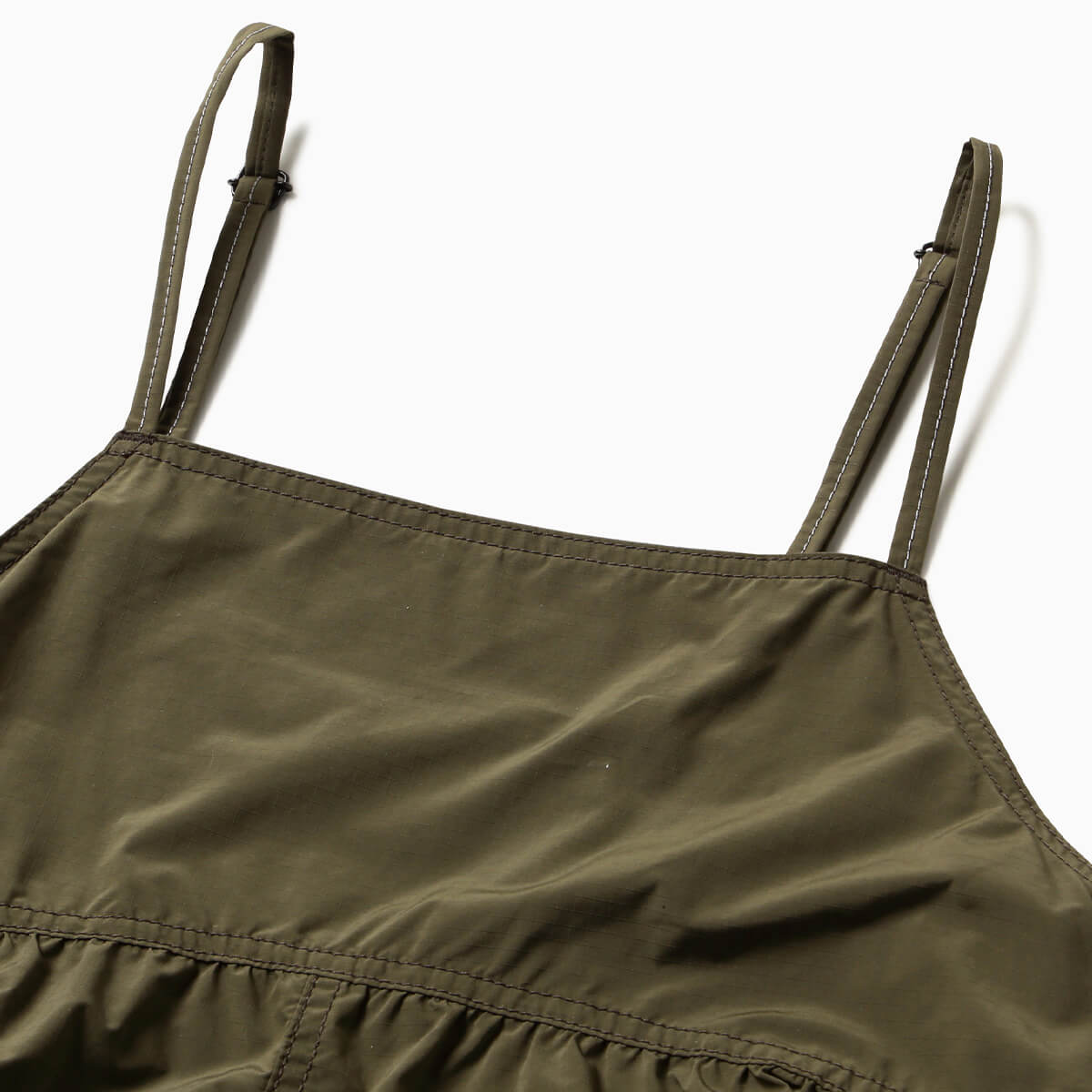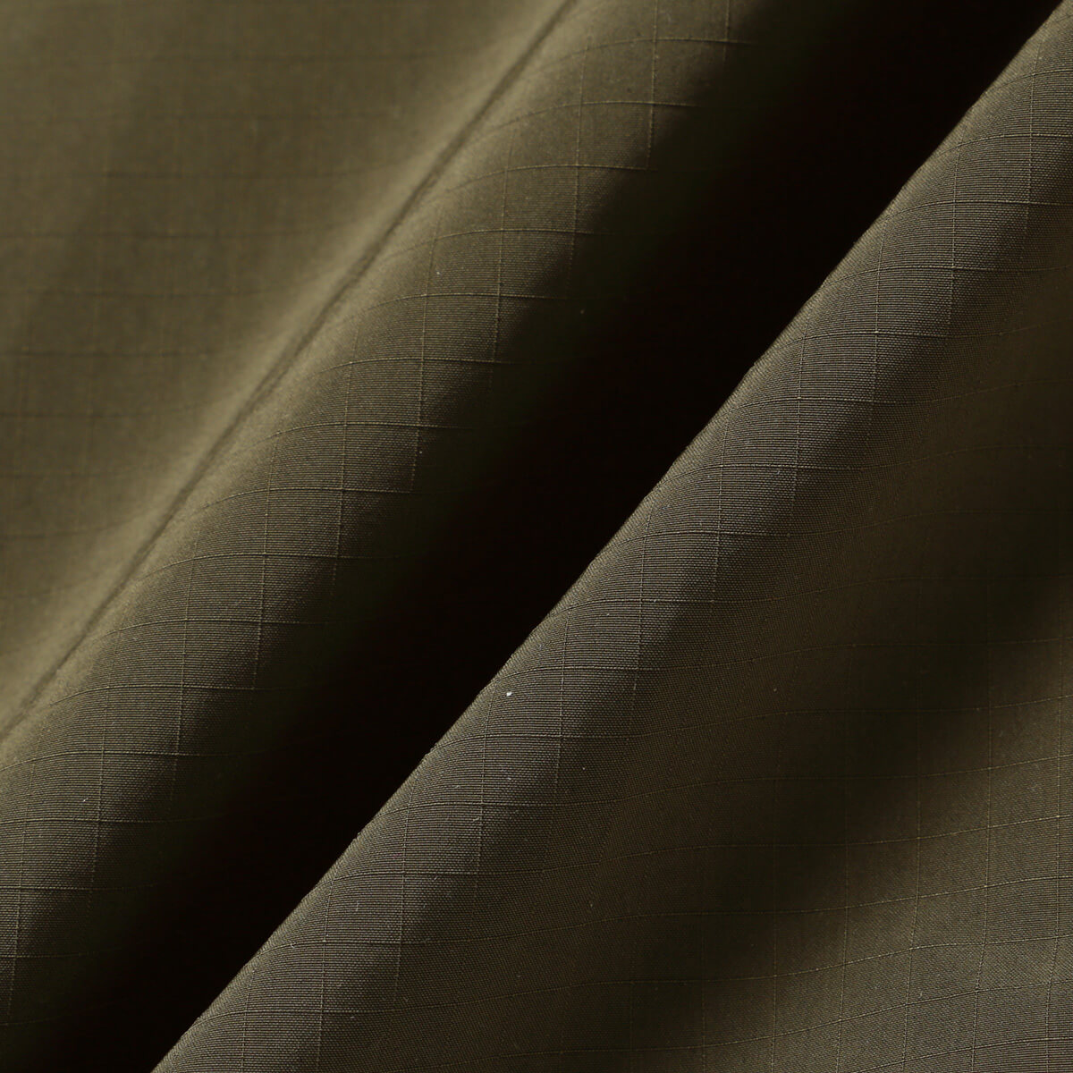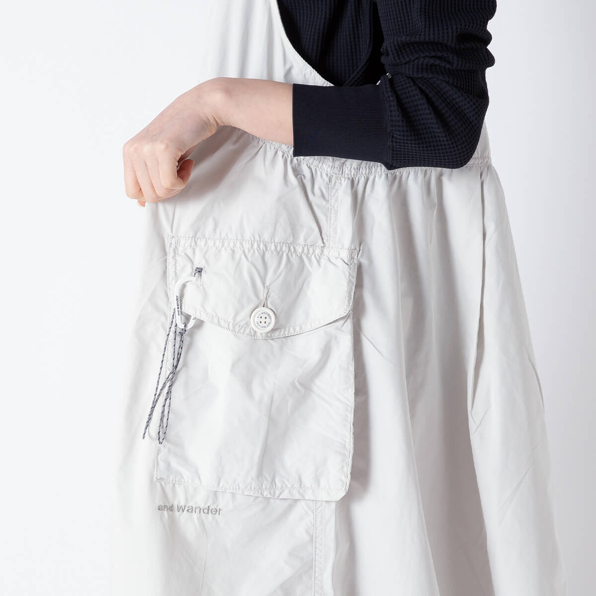 割繊糸を使った独特のハリ感と発色性のある撥水のリップ素材です。カーゴパンツのポケットを配したワンピースです。
