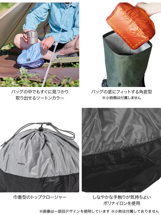 バッグの底にフィットする角底型。M(5L)サイズはクッカーとバーナー行動食、1泊2日の衣服など用途に応じてまとめて収納したい道具をしまうのに使いやすいサイズです。