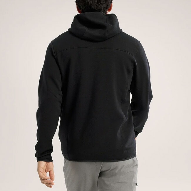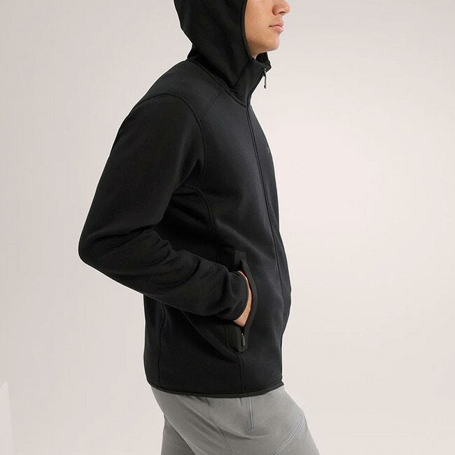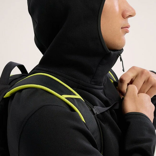 シェルの下にレイヤリングしてももたつかず、薄型のフードが暖かさをプラスしてくれます。