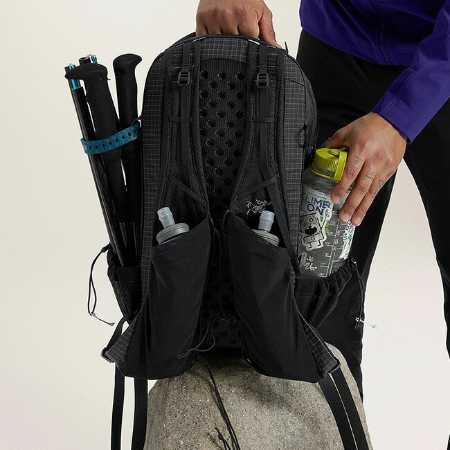 小雨を弾き、トレイルでの衝撃や擦れ、破れに強い、極めて頑丈な超軽量グリッドパック素材を使用。