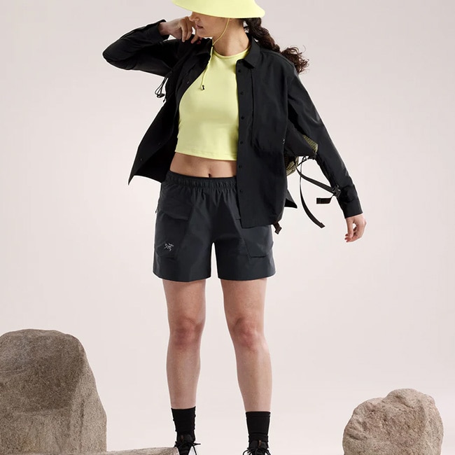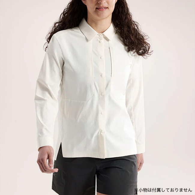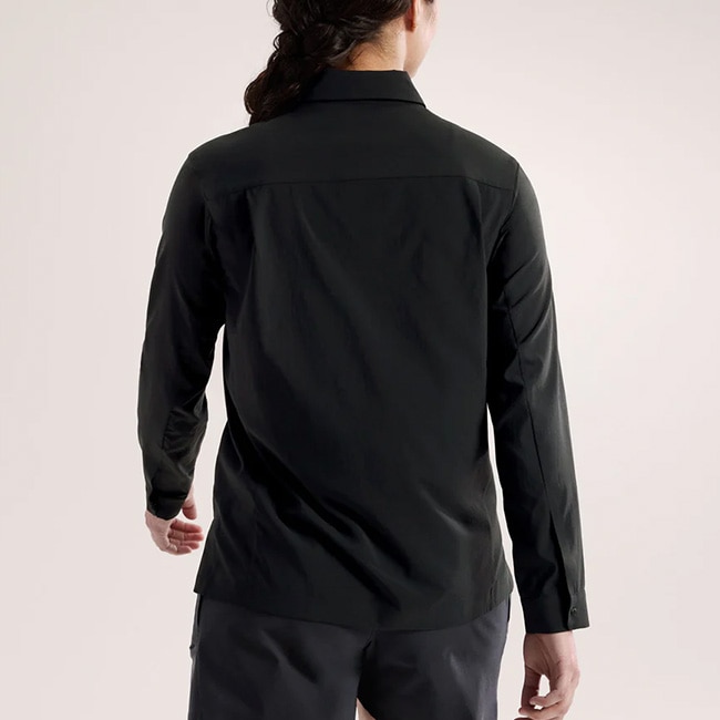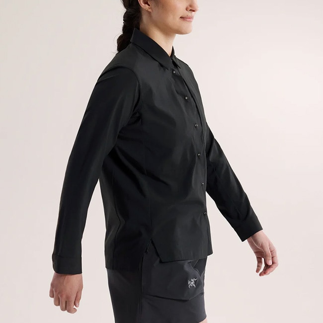 暑い天候でのハイキングに最適な、UPF 40の保護機能を備えた通気性のある長袖のスナップフロントシャツです。軽量で風通しが良く、パックからアクセス可能なポケットにはメッシュの裏地が施されており、さらなる通気性を提供します。