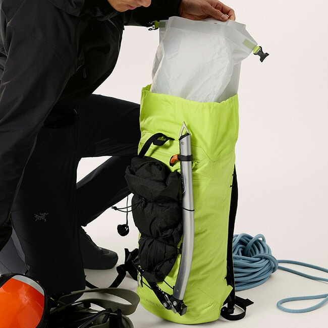 デュアルのアイスツールアタッチメントや前面のラッシュポイント、荷物の圧縮やクランポン・ジャケットの取り付けに使えるバンジーシステムなど、クライミングやアルパイン行動での実用性を高めるディテールも備えています。