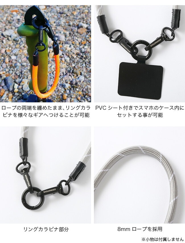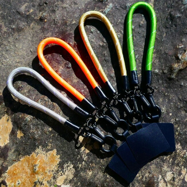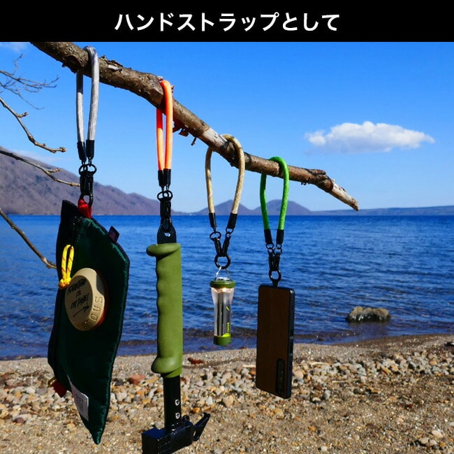 普段使用しているスマートフォン、ハンマー、LEDランタンなどに装着して『ハンドストラップ』として使うのはもちろんのこと、登山やスノーボードなどでの落下防止の『リーシュ』として、ポーチやカゴなどに取り付けて『グラブハンドル』にすることなど、発想次第で用途は多岐にわたります。