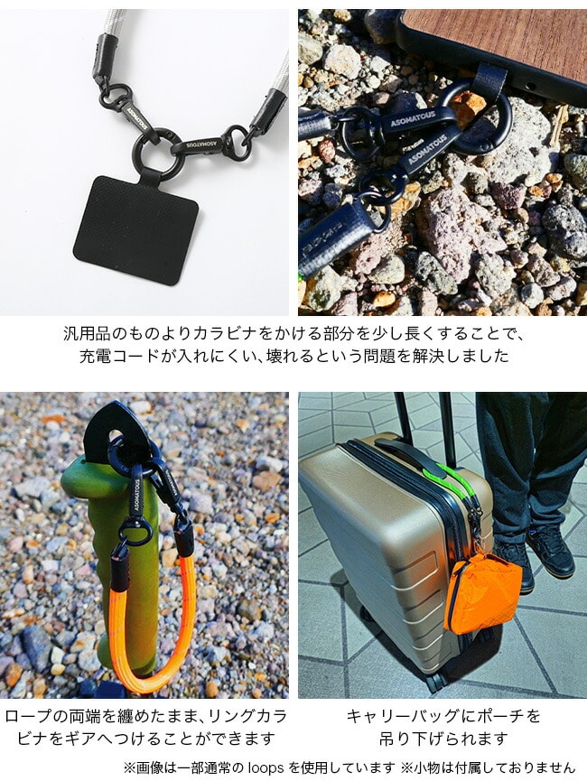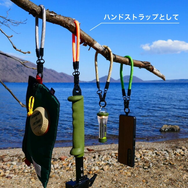 普段使用しているスマートフォン、ハンマー、LEDランタンなどに装着して『ハンドストラップ』として使うのはもちろんのこと、登山やスノーボードなどでの落下防止の『リーシュ』として、ポーチやカゴなどに取り付けて『グラブハンドル』にすることなど、発想次第で用途は多岐にわたります。