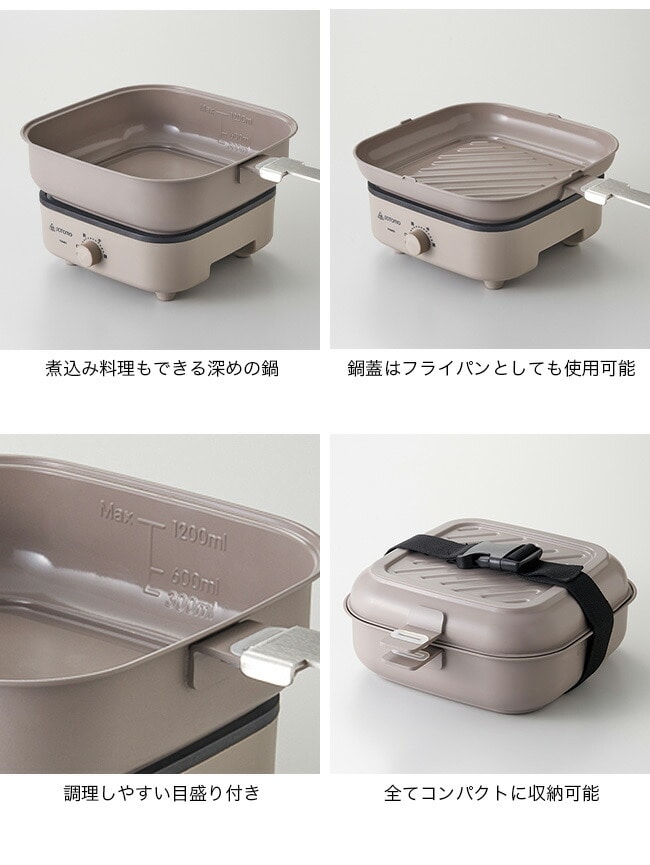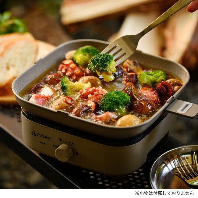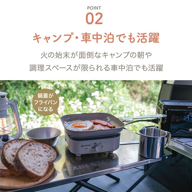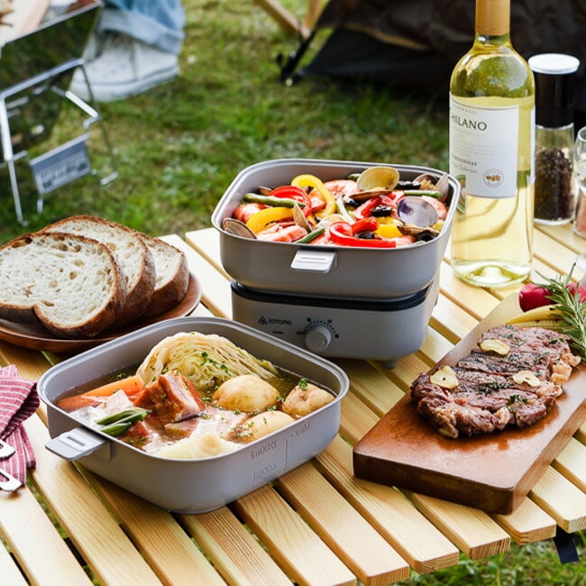 室内はもちろんポータブル電源を使って車内泊やアウトドアでも使える電気クッカーです。