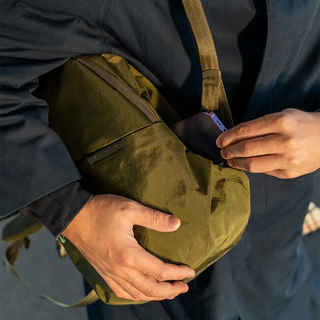 前面にはフロントポケットに加え、ボトルを覆い隠すこともできる差し込み式ポケット、背面にはセキュリティ効果の高いジッパー式ポケット、ショルダーストラップには瞬時にカードを出し入れできる専用スロットなど、機能性に富んだ仕分けポケットが効果的に配置されています。
