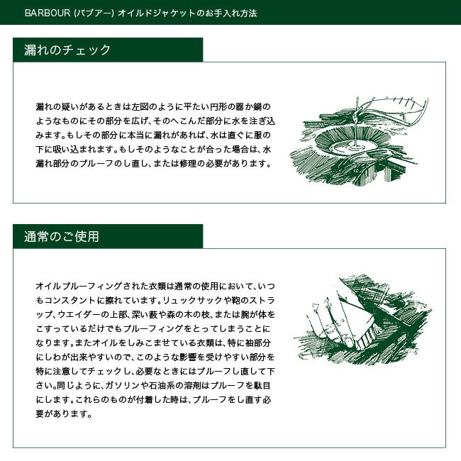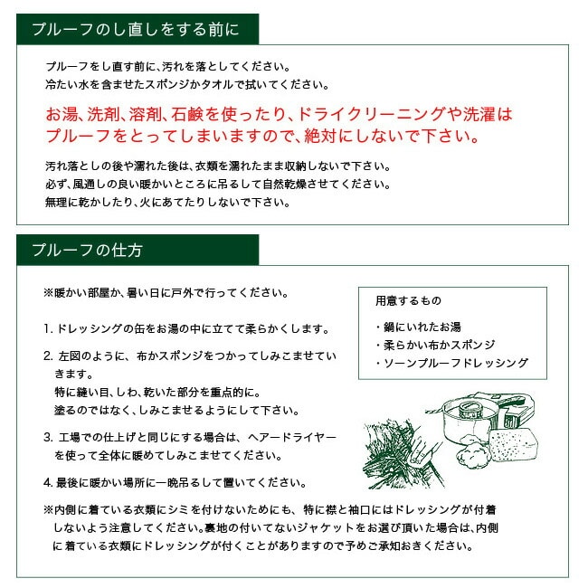 塗りなおすことで防水効果や耐久性が持続します。ご使用量のご案内としまして、ビデイル、ビューフォートは1着分で容量の約半分(100~150ml)、丈の長いバーレー、ボーダーは1着分で約150~200mlを要する目安となります。