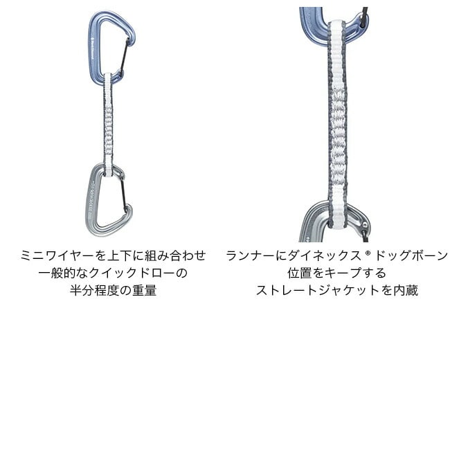 最小カラビナ・ミニワイヤーを上下に組み合わせました。一般的なクイックドローの半分程度の重量で、1gでも軽量化を図りたいビッグウォール、マルチピッチ、アルパインルートなどに最適です。