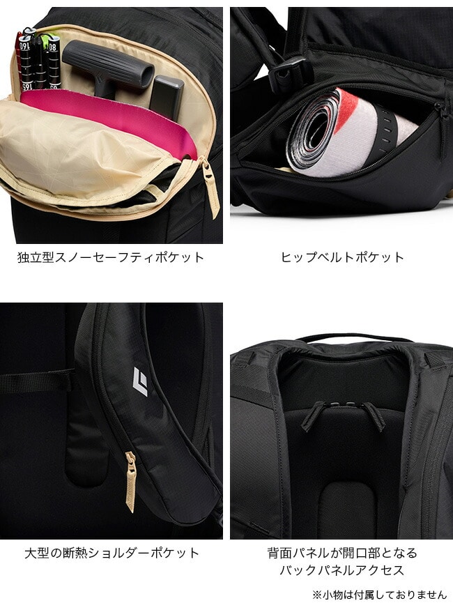 ワンデイツアーに必要な装備、食糧、水、予備のウェア、スノーセーフティギアなどを過不足なく収納できるバックカントリーパック。