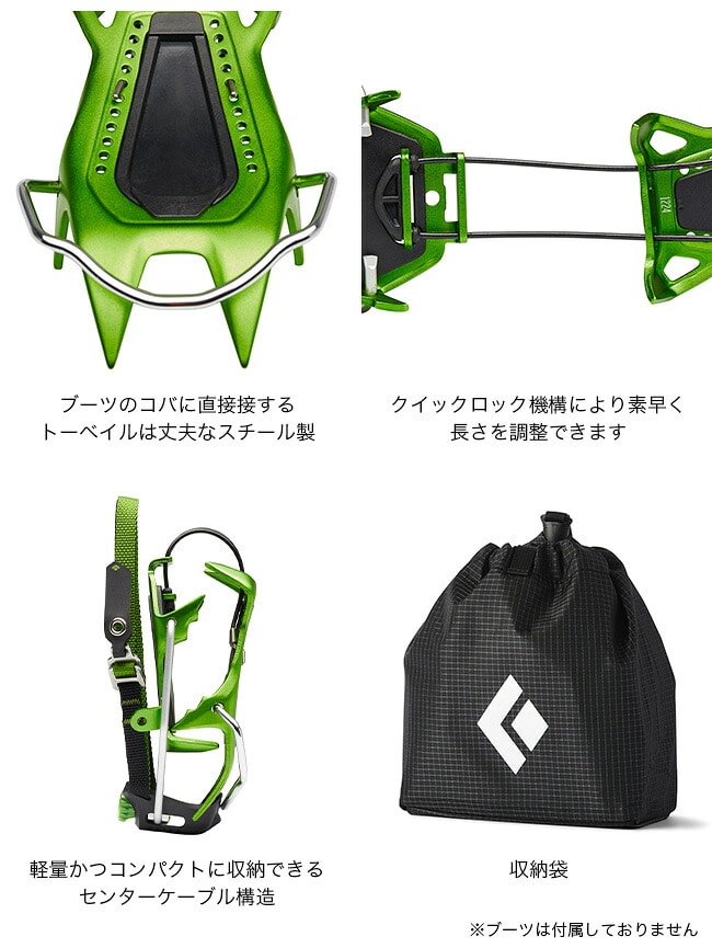 シンプルなクイックロックシステムを採用、工具なしで素早く長さ調整が可能。ブーツのコバに直接接するトーベイルは丈夫なスチール製です。