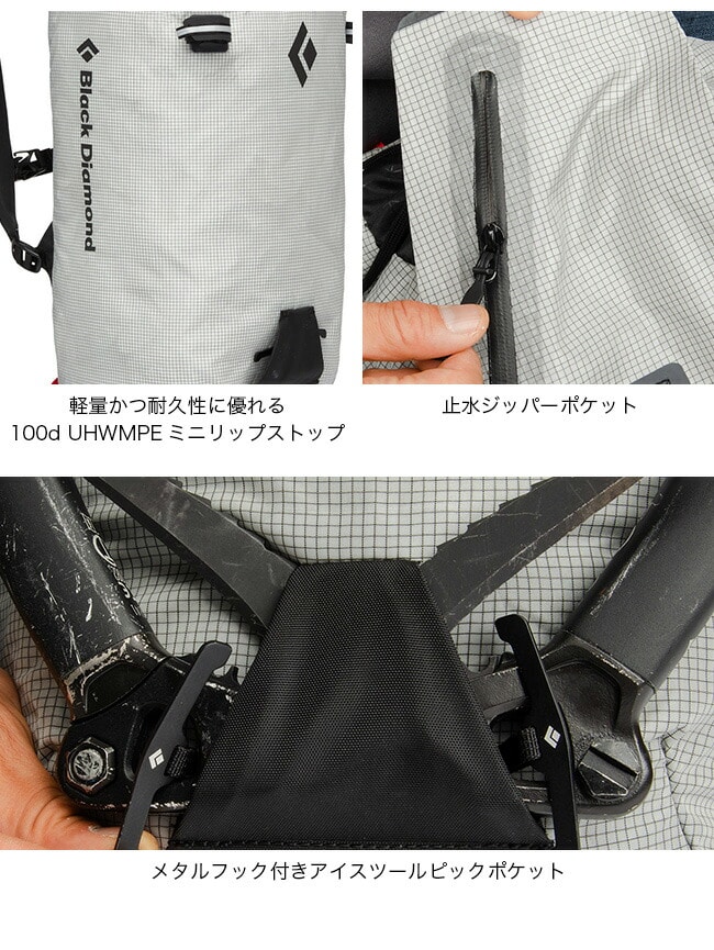 軽さ、耐摩耗性、撥水性に優れた100d UHWMPE ミニリップファブリックを採用。またアックスの固定方法がバックル止めからメタルフックに変更され、ぶれにくくなりました。