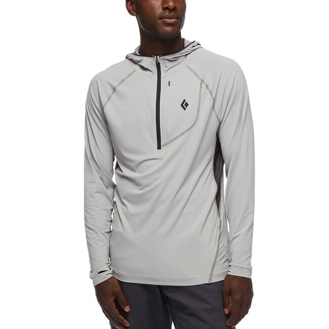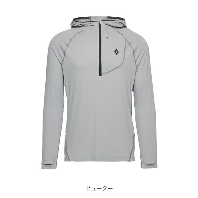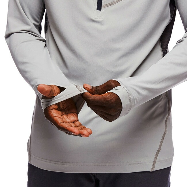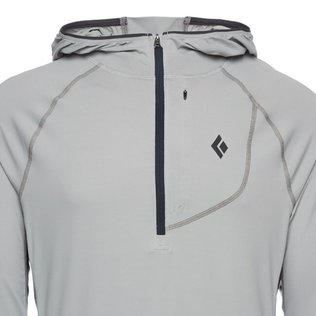 体温調節が容易な1/4ジッパーや脇下にメッシュパネル、隠し胸ポケット、親指ループ、ヘルメットと互換性のあるフードを備えており多様なシーンでパフォーマンスを発揮します。