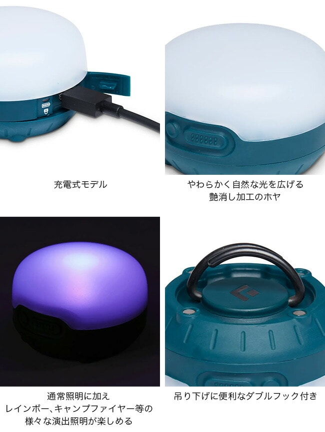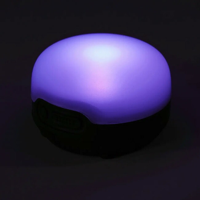 アウトドアから日常使いまで、場所を選ばず手軽に持ち運べる設計が魅力です。最大200ルーメンの白色ライト(点灯・ストロボ)に加え、フルカラーのレインボーライトや、リラックスした雰囲気を演出するキャンプファイヤーモードを搭載。
