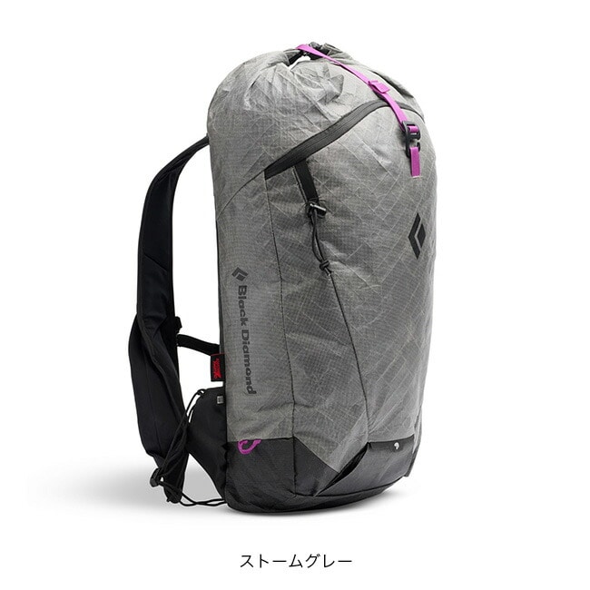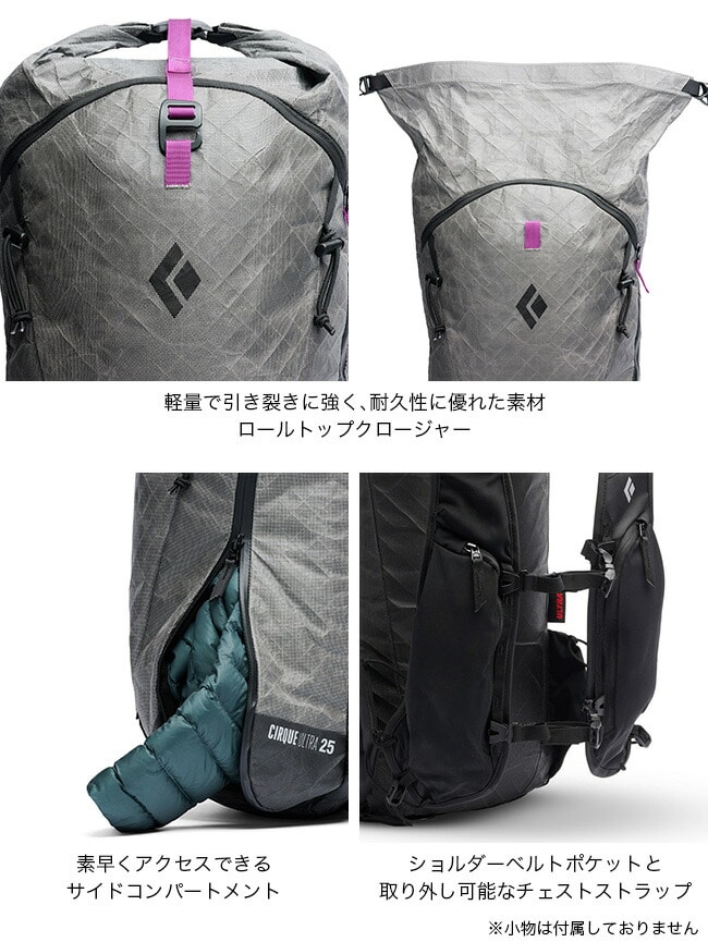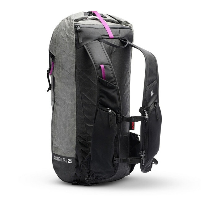 サークウルトラ25は薄型デザインで、ロールトップ開閉式のロールトップクロージャー、ダイアゴナルスキーキャリーストラップ、アバランチセーフティギア用のクイックアクセス外部ポケットを装備。Challenge Sailcloth社と提携、同社のUltra 200D/400Dを採用して軽さと耐久性を両立しています。