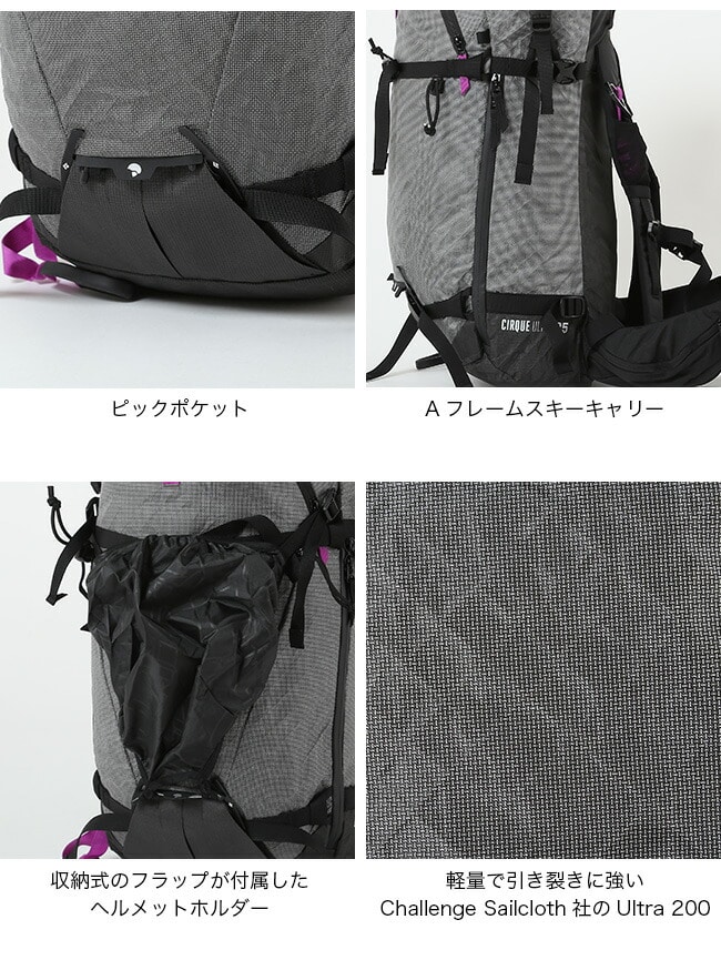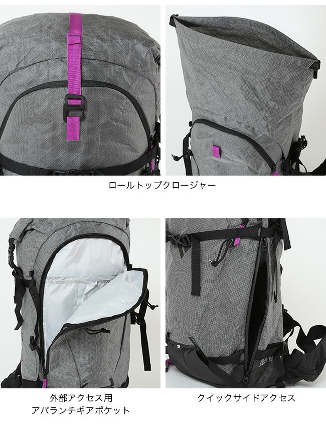 ウルトラライトパックの新たなベンチマーク「ベータライト」をベースに、奥深く厳しいスキーラインに挑むためにカスタマイズ。薄型デザインで、ロールトップ開閉式のロールトップクロージャー、ダイアゴナルスキーキャリーストラップ、アバランチセーフティギア用のクイックアクセス外部ポケットを装備。