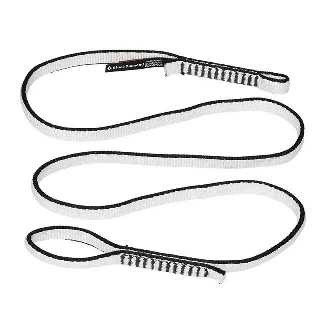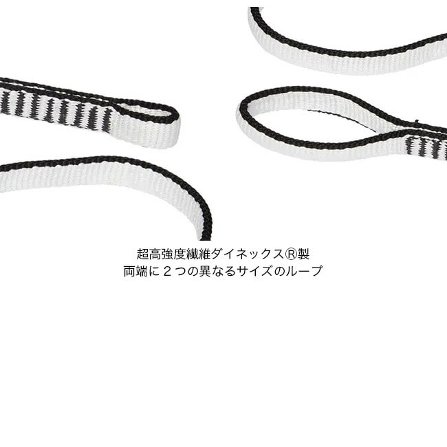 カラビナを安定して保持する小さめのループと、ガースヒッチやカラビナ追加に便利な大型ループの2つを備え、さまざまなクライミングシーンに対応します。2つのループはそれぞれサイズが異なり、小さい方はカラビナを通すのに、大きい方はガースヒッチで結びつけるのに適しています。