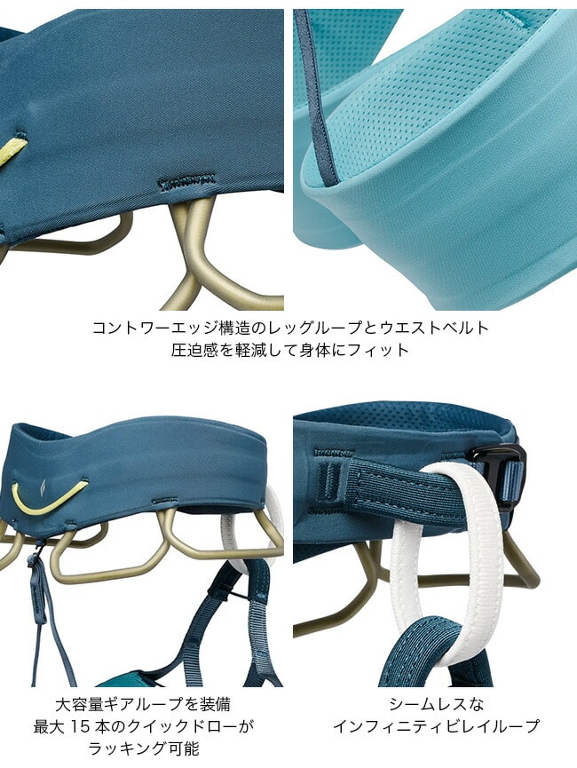 さらにシームレスなインフィニティビレイループと、後部に5つめのギアループも備えており、オールラウンドクライマーに理想的なハーネスとなっています。