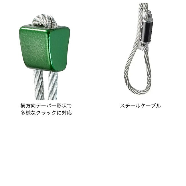 1972年にChouinard Equipmentが開発した初期のチョックにルーツを持つ、クリーンクライミングの歴史を受け継ぐアイテムです。アルミヘッドと亜鉛メッキスチールケーブルを組み合わせた耐久性の高い構造に加え、横方向にテーパーを持たせた形状により、フレアクラックやコンストリクション、平行クラックなど幅広いクラック形状に対応。