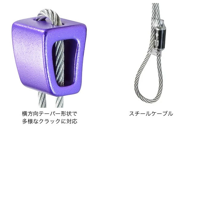 1972年にChouinard Equipmentが開発した初期のチョックにルーツを持つ、クリーンクライミングの歴史を受け継ぐアイテムです。アルミヘッドと亜鉛メッキスチールケーブルを組み合わせた耐久性の高い構造に加え、横方向にテーパーを持たせた形状により、フレアクラックやコンストリクション、平行クラックなど幅広いクラック形状に対応。
