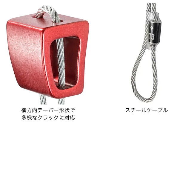 1972年にChouinard Equipmentが開発した初期のチョックにルーツを持つ、クリーンクライミングの歴史を受け継ぐアイテムです。アルミヘッドと亜鉛メッキスチールケーブルを組み合わせた耐久性の高い構造に加え、横方向にテーパーを持たせた形状により、フレアクラックやコンストリクション、平行クラックなど幅広いクラック形状に対応。