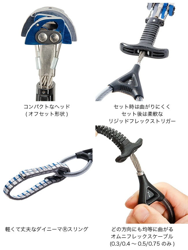 4ローブはサンドブラスト仕上げで保持力を高め、旧モデルCamalot C3に近いヘッド幅で狭いクラックにも対応します。
