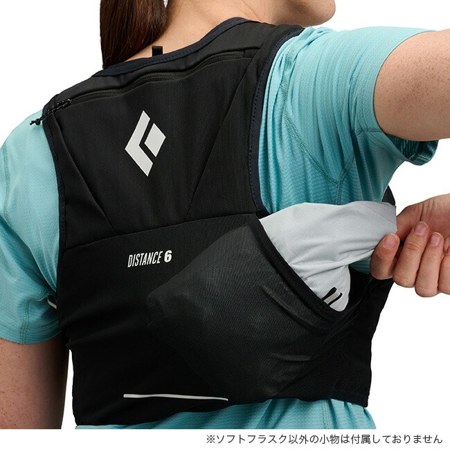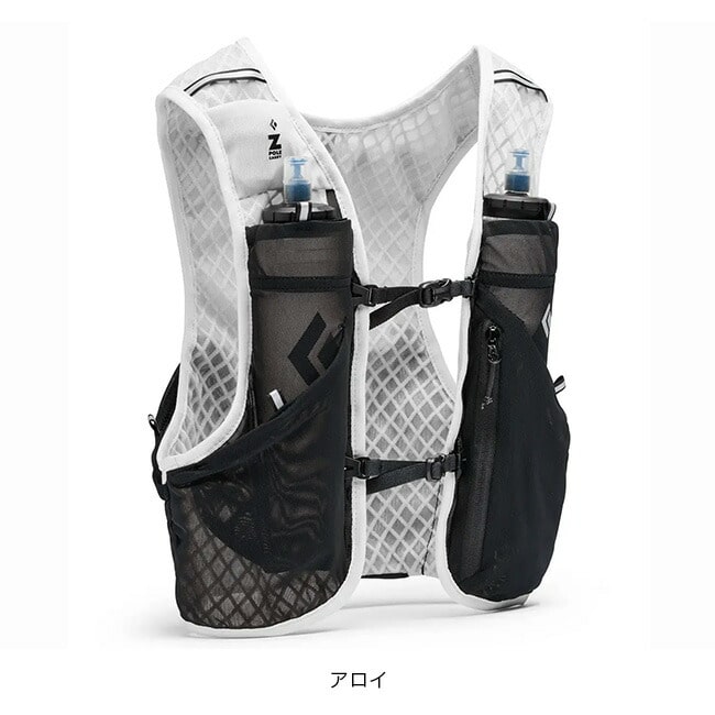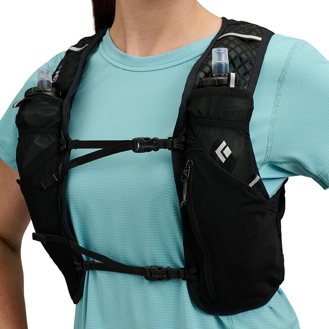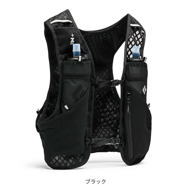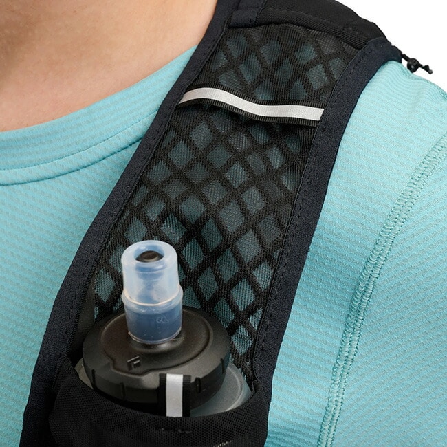 フロントには500mlのソフトフラスク(2本付属)が収まる専用ポケットを備えています。